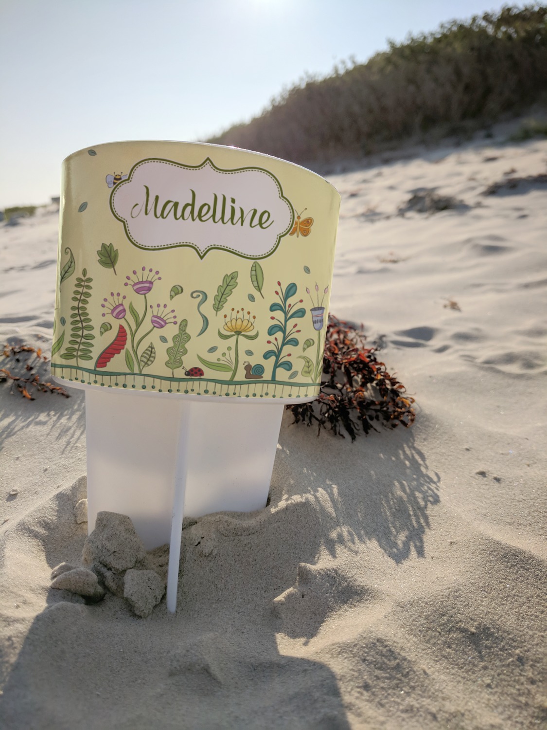 This cup holder has a large stake at its bottom that anchors it to the sand or ground below, while the cup holder rests above the stake. The entire drink holder is made of durable plastic and displays your customization around the cup holder portion. We sell these personalized beach spikers in two different colors: black and white.