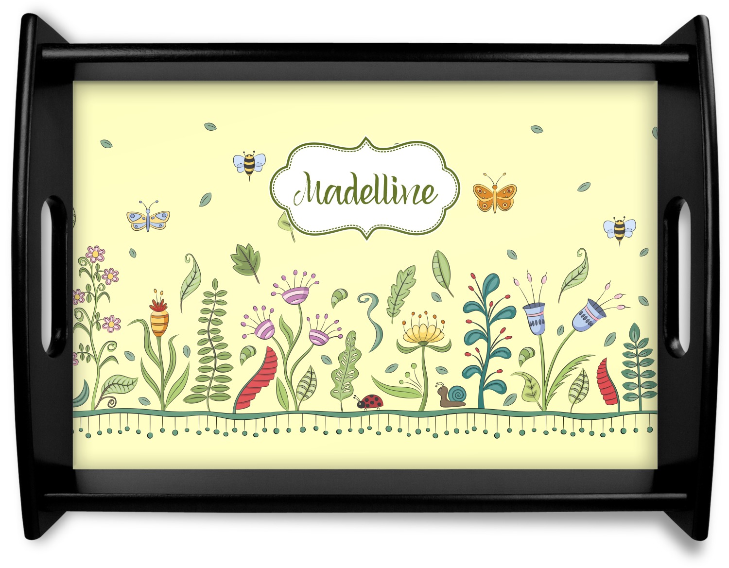This serving tray with handles features square edges and two rounded sides, creating a very modern look. Each side is fabricated from a beautifully cut, natural wood. The bottom of the interior of the tray displays your customized design in bright, vibrant color. The tray is sold in both a black color and a natural wood look. Each variation of the wood serving tray has two sizes: Small, which is 14" x 10" x 2.25", and Large, which is 19.5" x 13.5" x 2.75".