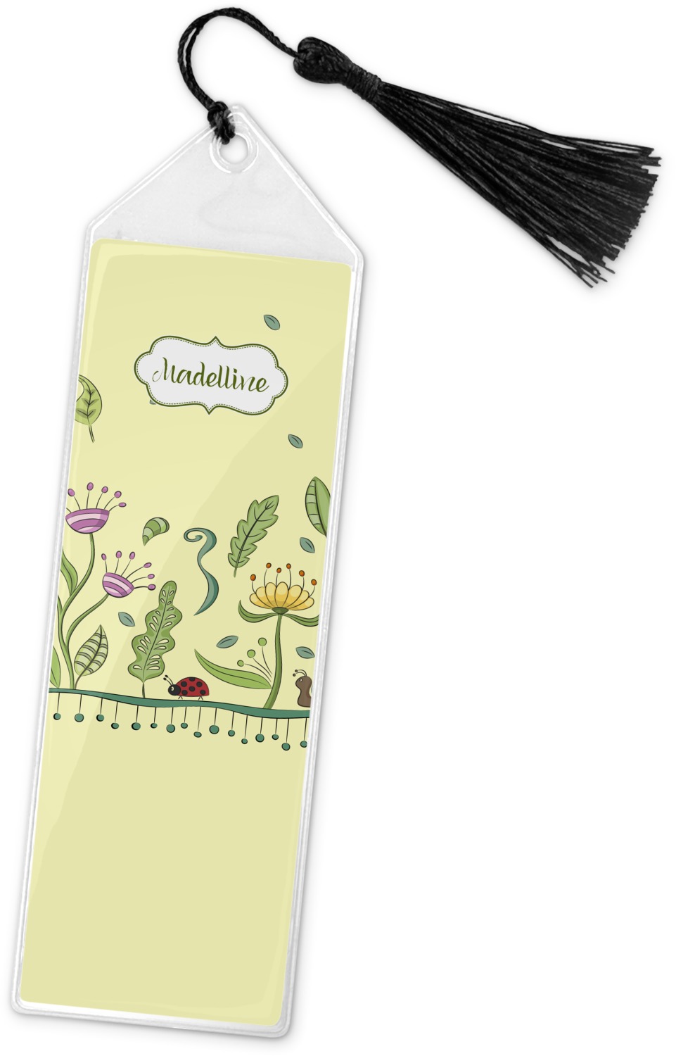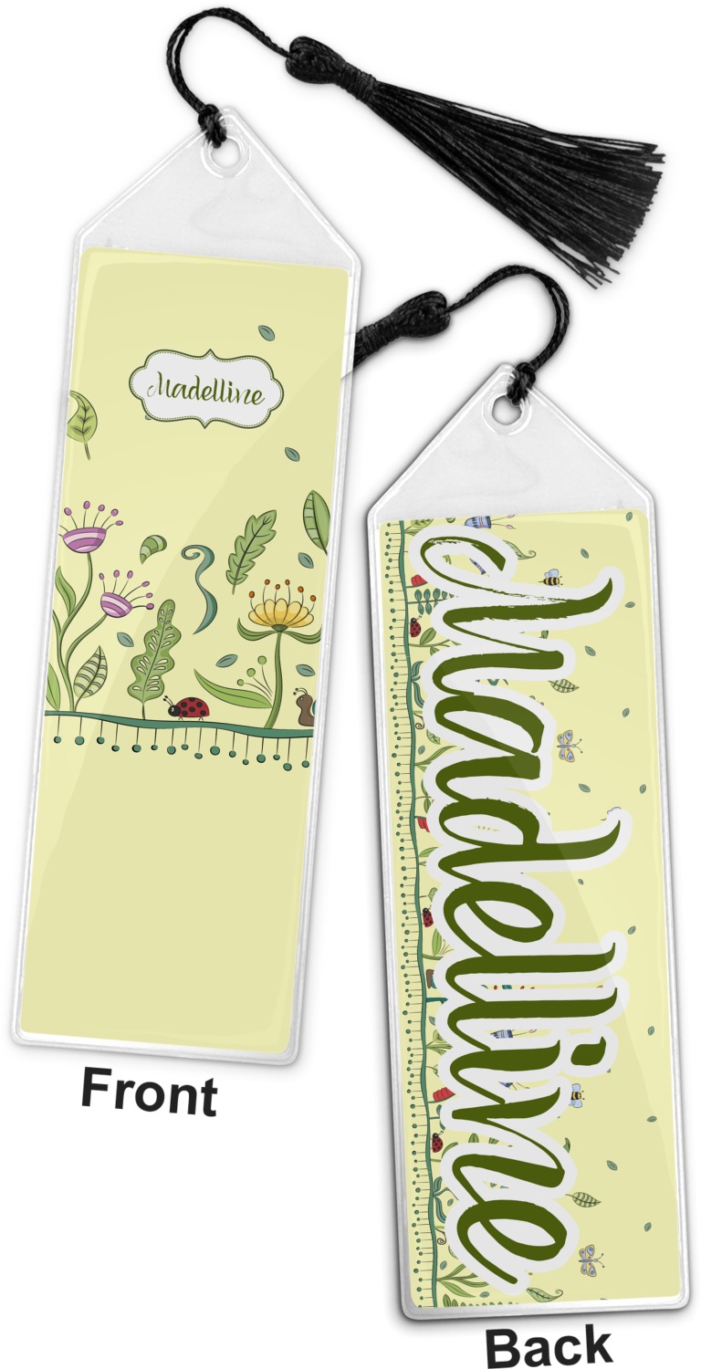 Your personalized bookmark is made of a sturdy, clear vinyl, and is approximately 7.5" x 2.25". We display your personalization on vinyl inserts that are placed on both sides. Accompanying each book marker is a black, fringe tassel that attaches to the reinforced, triangular header.