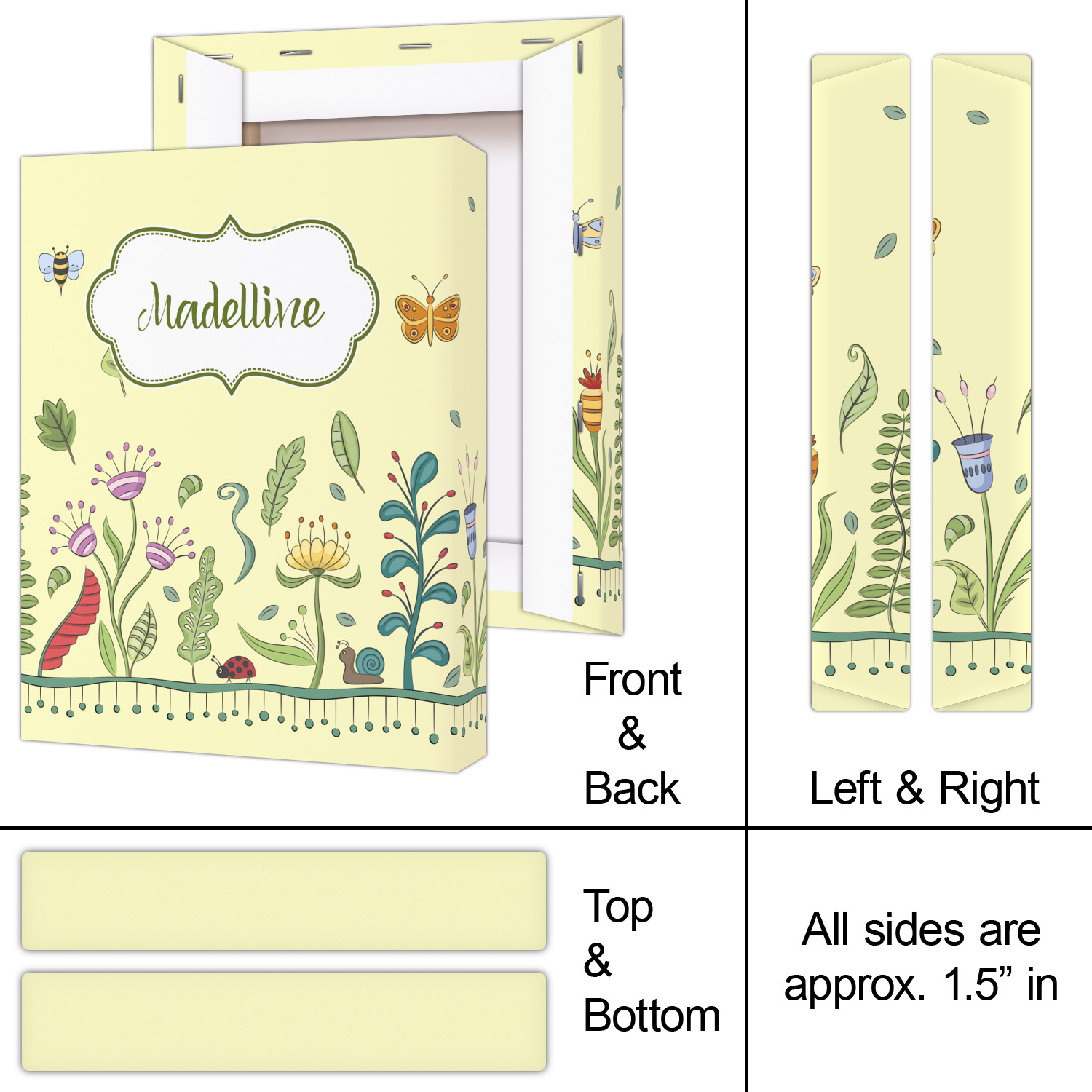 This beautiful, yet simple and elegant nature inspired design consists of growing flowers, leaves and the insects that are found around flowers such as ladybugs, bees, butterflies and snails. We have featured the design with a light yellow background, however, you can change it to any color you want. Changing the background color to a navy blue or black changes the look from sweet to elegant! Your personalization goes in a rectangular label across the top. The coordinating pattern and elements are all related to flowers and insects as well.