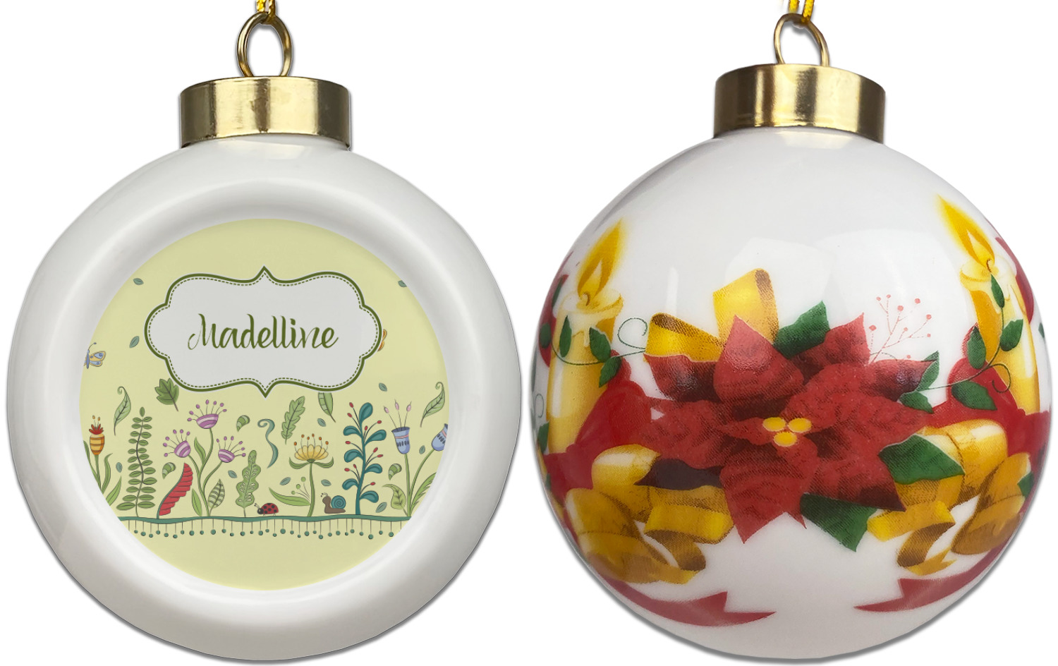 Our Christmas ornaments are a unique ceramic ball shape with a twist as it has a flat face to display your custom design! Select from one of our two design types - Christmas Tree or Poinsettia Garland - to adorn the curved back of your personal design. Each ornament measures 3H x 2.5W x 2D accompanied with a gold string accent for finishing touches to hang on your beautiful Christmas tree!