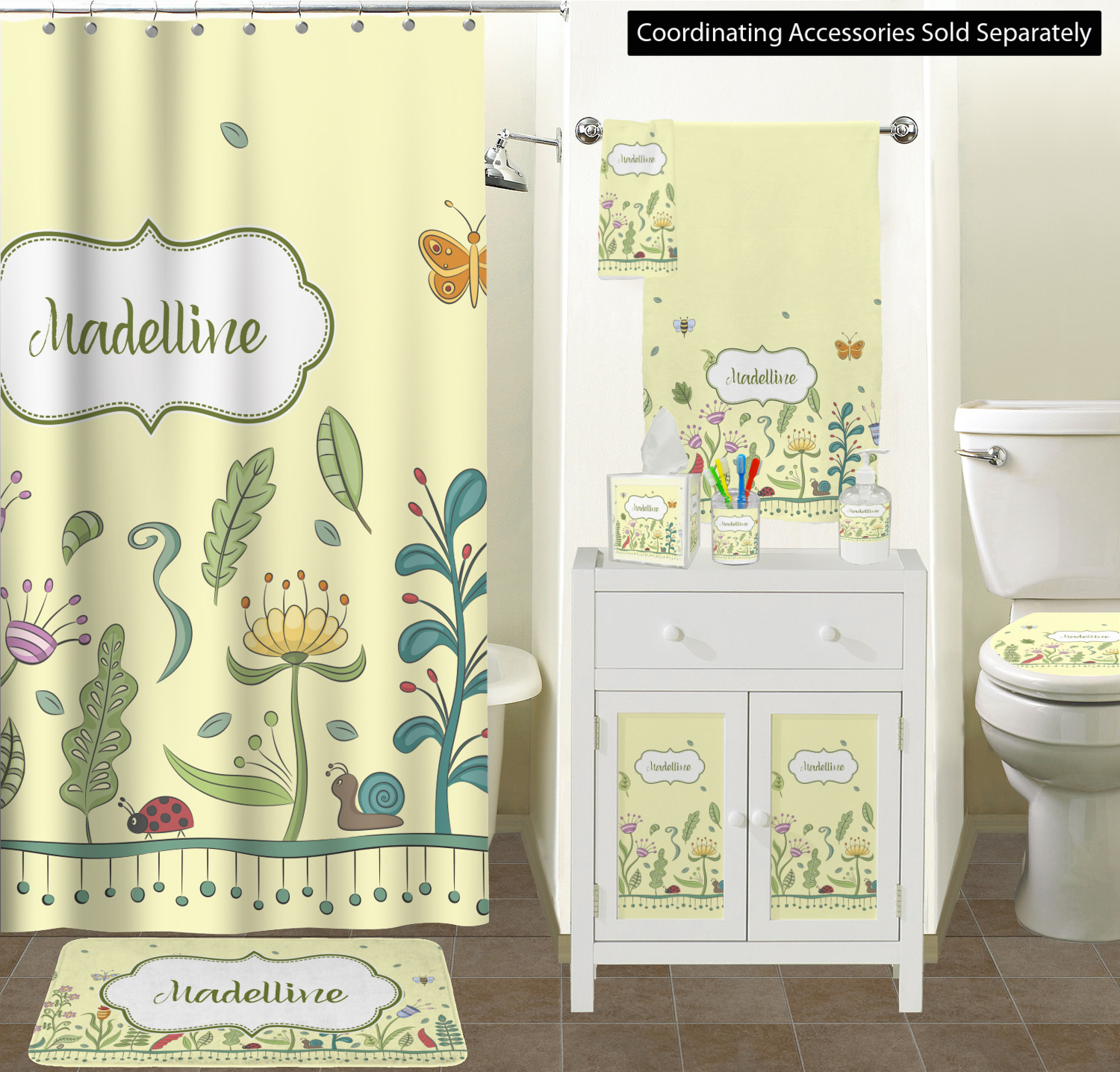This beautiful, yet simple and elegant nature inspired design consists of growing flowers, leaves and the insects that are found around flowers such as ladybugs, bees, butterflies and snails. We have featured the design with a light yellow background, however, you can change it to any color you want. Changing the background color to a navy blue or black changes the look from sweet to elegant! Your personalization goes in a rectangular label across the top. The coordinating pattern and elements are all related to flowers and insects as well.