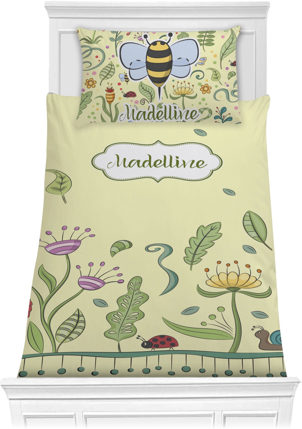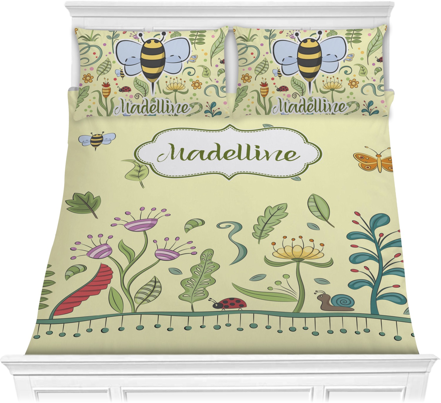 This beautiful, yet simple and elegant nature inspired design consists of growing flowers, leaves and the insects that are found around flowers such as ladybugs, bees, butterflies and snails. We have featured the design with a light yellow background, however, you can change it to any color you want. Changing the background color to a navy blue or black changes the look from sweet to elegant! Your personalization goes in a rectangular label across the top. The coordinating pattern and elements are all related to flowers and insects as well.