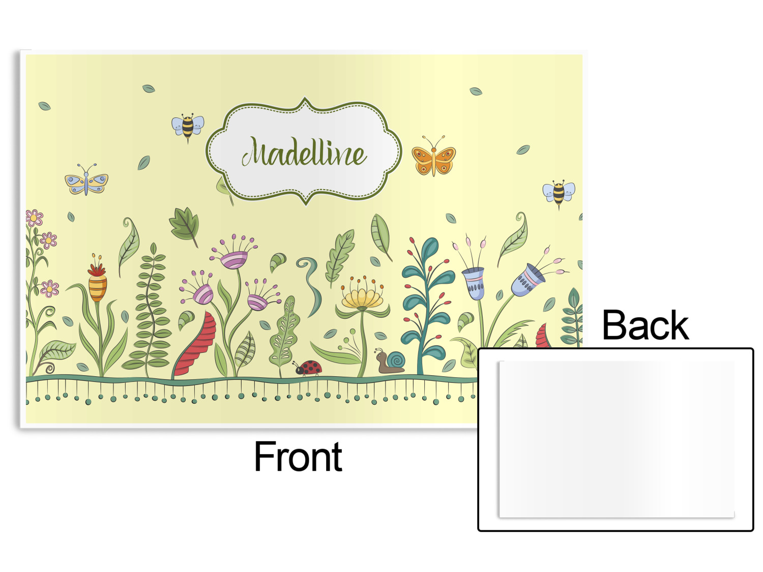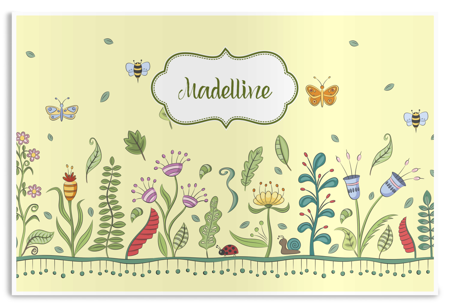 This beautiful, yet simple and elegant nature inspired design consists of growing flowers, leaves and the insects that are found around flowers such as ladybugs, bees, butterflies and snails. We have featured the design with a light yellow background, however, you can change it to any color you want. Changing the background color to a navy blue or black changes the look from sweet to elegant! Your personalization goes in a rectangular label across the top. The coordinating pattern and elements are all related to flowers and insects as well.