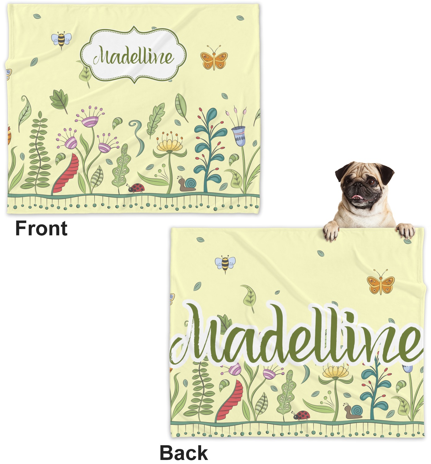 These dog blankets are crafted from a gentle, soft-to-the-touch, minky material. We print your customizations, either matching or differing, on both the top and underside of the blanket. These personalized dog blankets are available in two sizes: regular and large. Our regular size, at 40" x 30", accommodates small and some medium size dogs. At 60" x 50", our large dog blanket is a better fit for bigger breeds. Though specialized for dogs, these blankets still make a thoughtful gift for your favorite feline, or any other pet in mind!