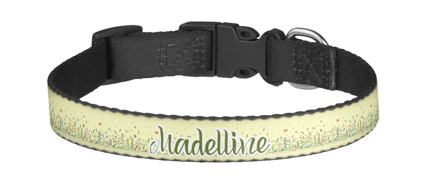 This sturdy collar, made from a durable nylon weave, will outlive your dog's episodes of excited tugging and pulling. Courtesy of its thick plastic buckle and adjuster, this collar is adjustable and accommodating of any dog. Structurally, the collar is a single piece of nylon weave that is sewn together, and features a solid metal loop where you can attach a leash or dog tag. We print and display your dog's name and pattern across the middle of the personalized dog collar.