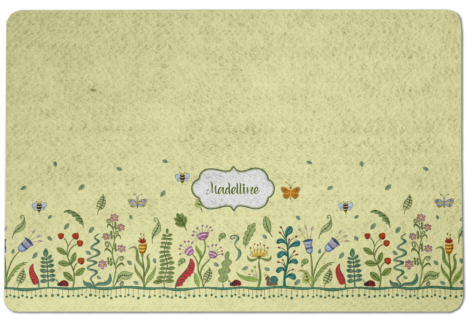 This beautiful, yet simple and elegant nature inspired design consists of growing flowers, leaves and the insects that are found around flowers such as ladybugs, bees, butterflies and snails. We have featured the design with a light yellow background, however, you can change it to any color you want. Changing the background color to a navy blue or black changes the look from sweet to elegant! Your personalization goes in a rectangular label across the top. The coordinating pattern and elements are all related to flowers and insects as well.