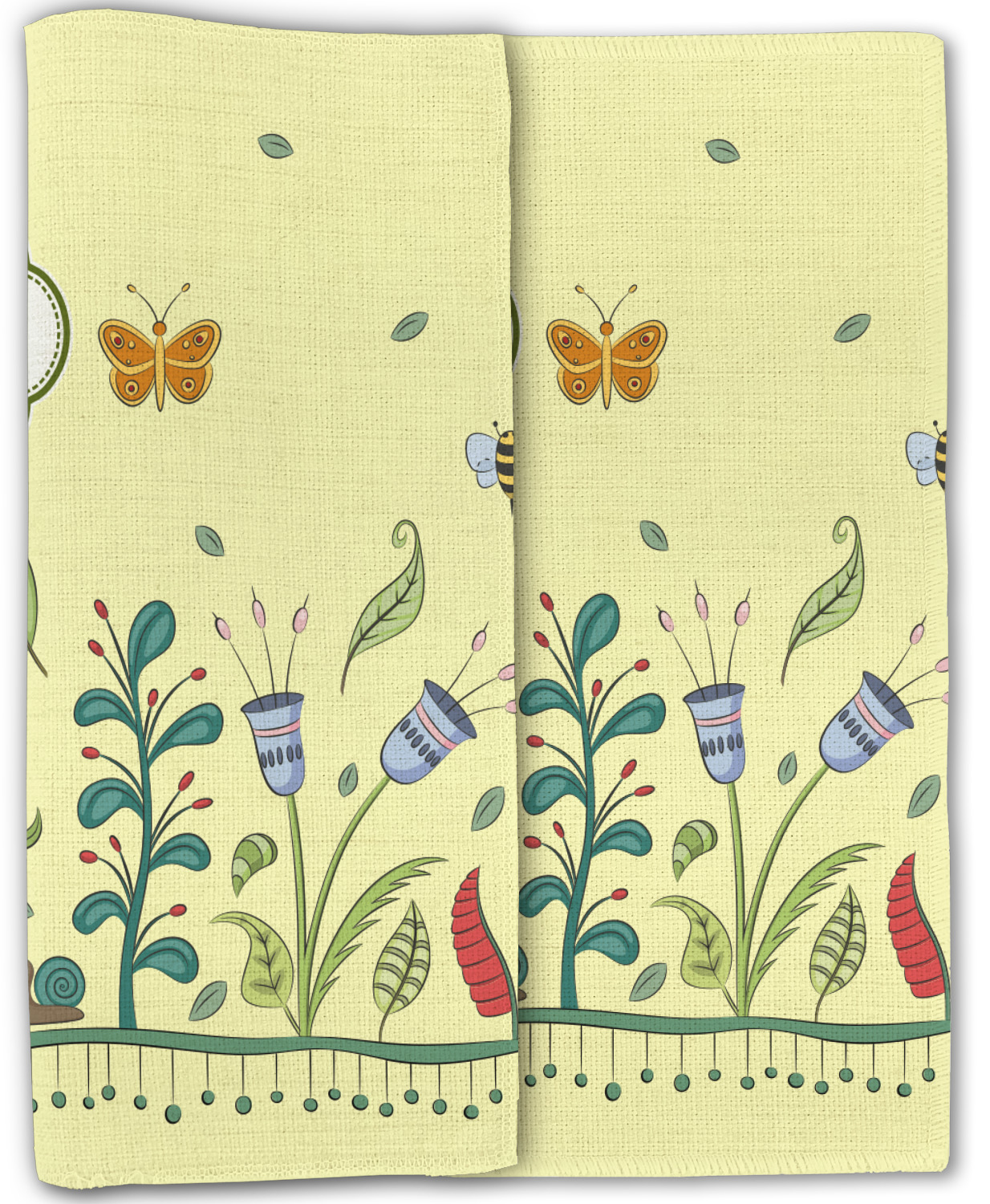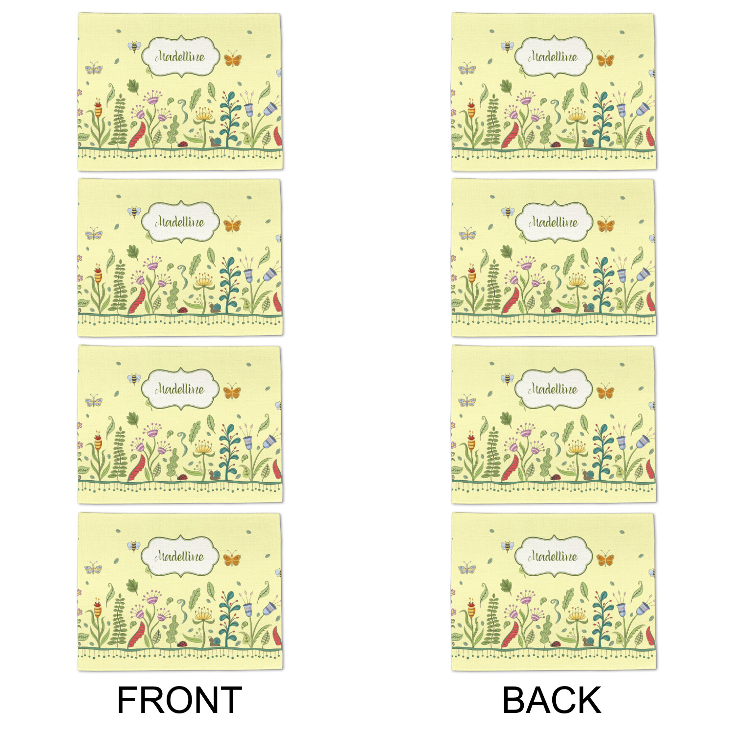 This beautiful, yet simple and elegant nature inspired design consists of growing flowers, leaves and the insects that are found around flowers such as ladybugs, bees, butterflies and snails. We have featured the design with a light yellow background, however, you can change it to any color you want. Changing the background color to a navy blue or black changes the look from sweet to elegant! Your personalization goes in a rectangular label across the top. The coordinating pattern and elements are all related to flowers and insects as well.