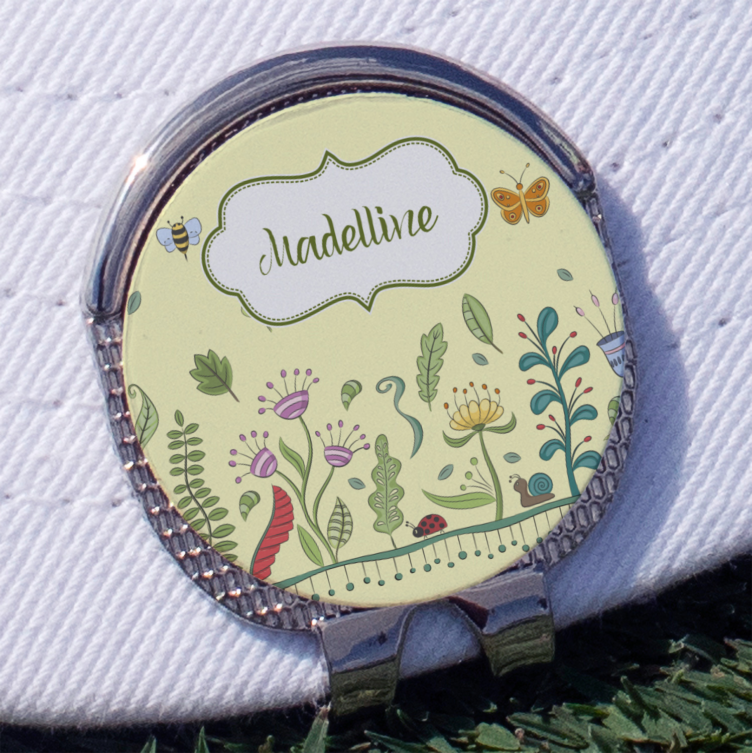 This round shaped little clip is simply 1.25" x 1.5". A clip wraps around to the back of the ball marker holder in order to be able to clip it to the bill of your hat or even your belt. The metal ball marker attaches by a magnet on the clip. Available in stainless steel natural finish or gold finish, you are sure to find one to suit your style. This makes for convenient removal when you need to use it. No more digging in your bag or pockets trying to find it!