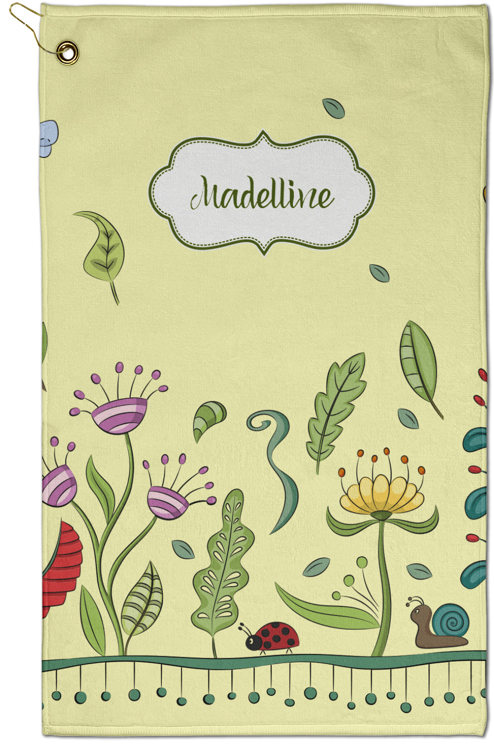 This beautiful, yet simple and elegant nature inspired design consists of growing flowers, leaves and the insects that are found around flowers such as ladybugs, bees, butterflies and snails. We have featured the design with a light yellow background, however, you can change it to any color you want. Changing the background color to a navy blue or black changes the look from sweet to elegant! Your personalization goes in a rectangular label across the top. The coordinating pattern and elements are all related to flowers and insects as well.