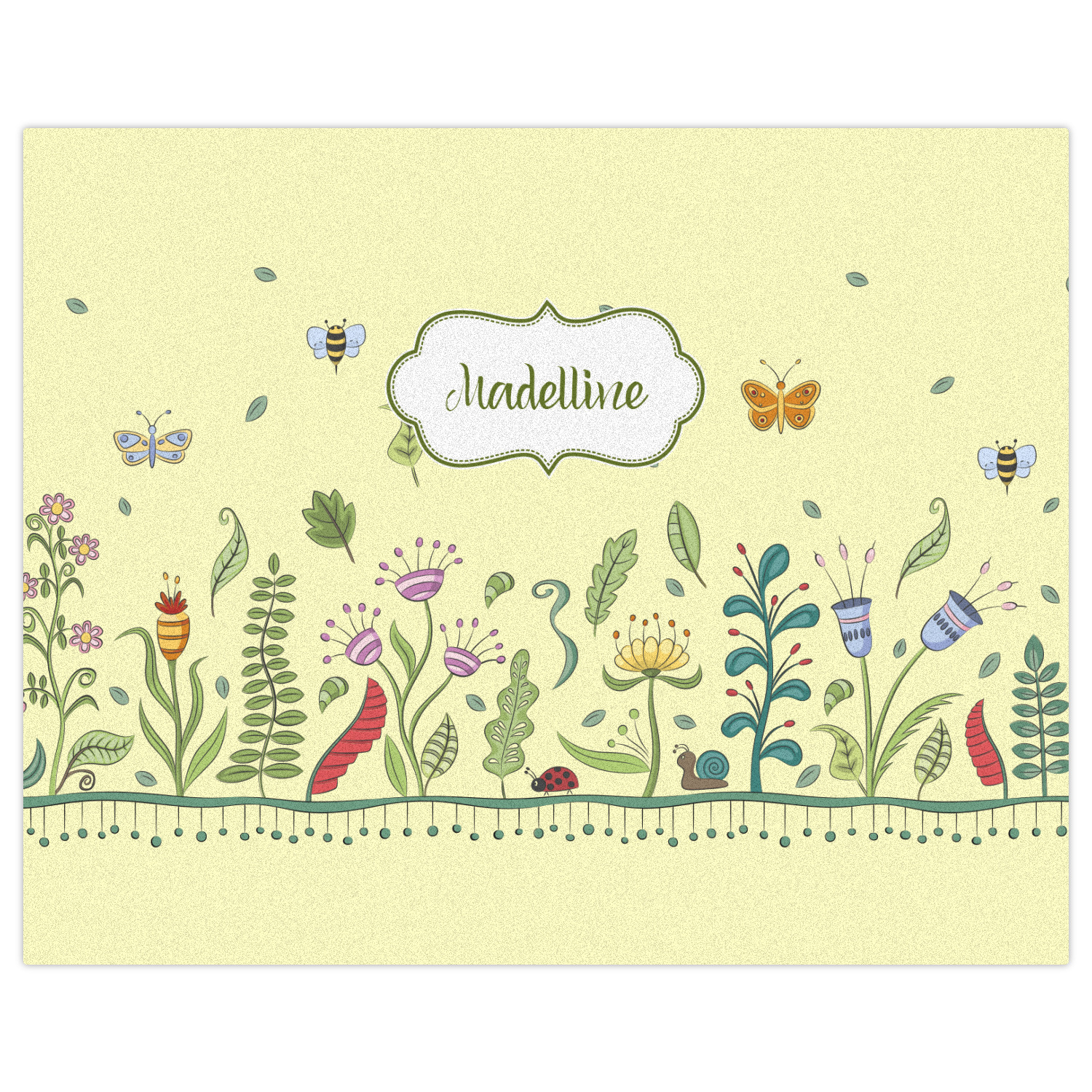 This beautiful, yet simple and elegant nature inspired design consists of growing flowers, leaves and the insects that are found around flowers such as ladybugs, bees, butterflies and snails. We have featured the design with a light yellow background, however, you can change it to any color you want. Changing the background color to a navy blue or black changes the look from sweet to elegant! Your personalization goes in a rectangular label across the top. The coordinating pattern and elements are all related to flowers and insects as well.