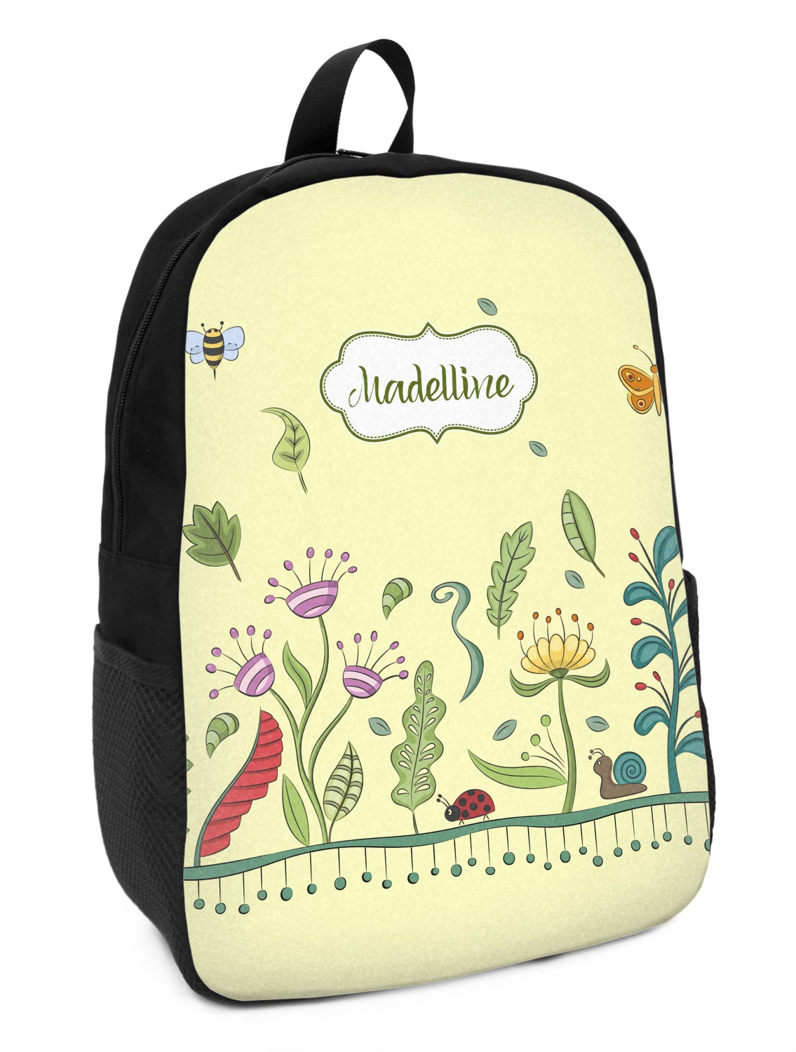 This beautiful, yet simple and elegant nature inspired design consists of growing flowers, leaves and the insects that are found around flowers such as ladybugs, bees, butterflies and snails. We have featured the design with a light yellow background, however, you can change it to any color you want. Changing the background color to a navy blue or black changes the look from sweet to elegant! Your personalization goes in a rectangular label across the top. The coordinating pattern and elements are all related to flowers and insects as well.