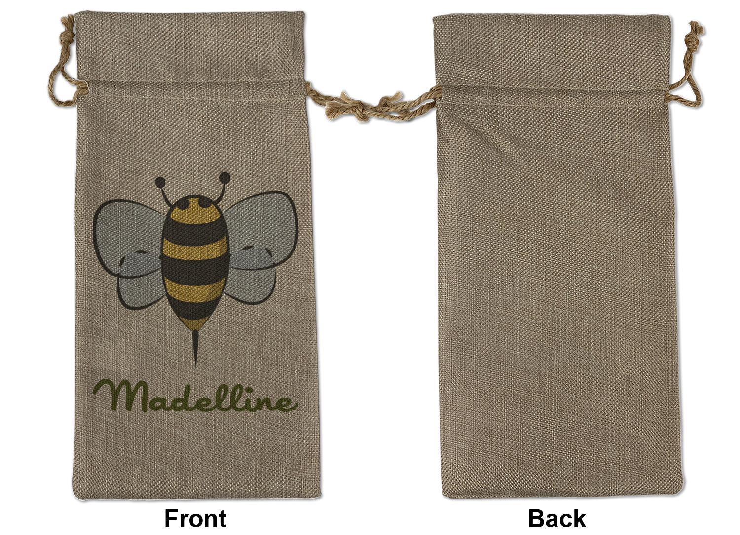 We sell our Burlap Gift Bags in 3 variant sized bags. Made with burlap polyester, each personalized bag can be secured with a twine drawstring pull. Your custom design is available to print on one side or both sides - completely up to you! The sizes of the bags measure approximately 4.5" x 6.5" for the smallest size, 6.5" x 8.0" for the medium size, and 6.5" x 13.5" for the large-sized bag.