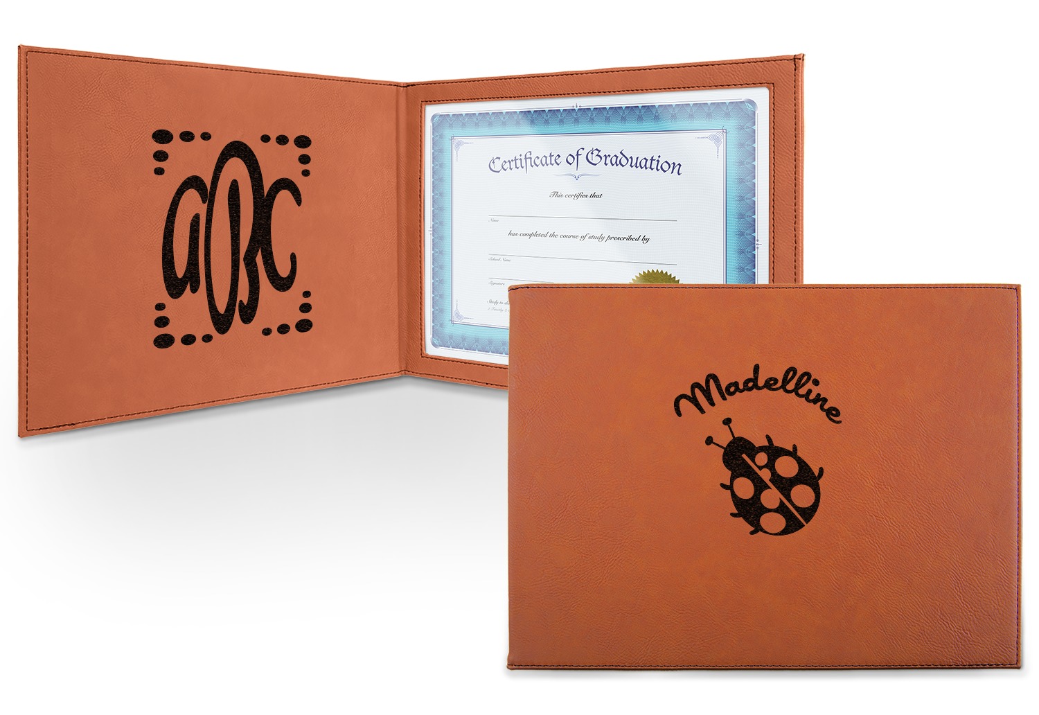 This cognac-colored, leatherette certificate jacket is the ideal way to display or store your hard-earned certificate. When closed, the custom certificate holder measures at 12 by 9 inches. The interior of the certificate cover includes a clear, vinyl window to encase your diploma. The window measures at around 10.5 by 7.5 inches and can accommodate a diploma that measures at up to 8.5 by 11 inches. You can either choose to have your customization laser engraved on the front and interior, or solely the front.