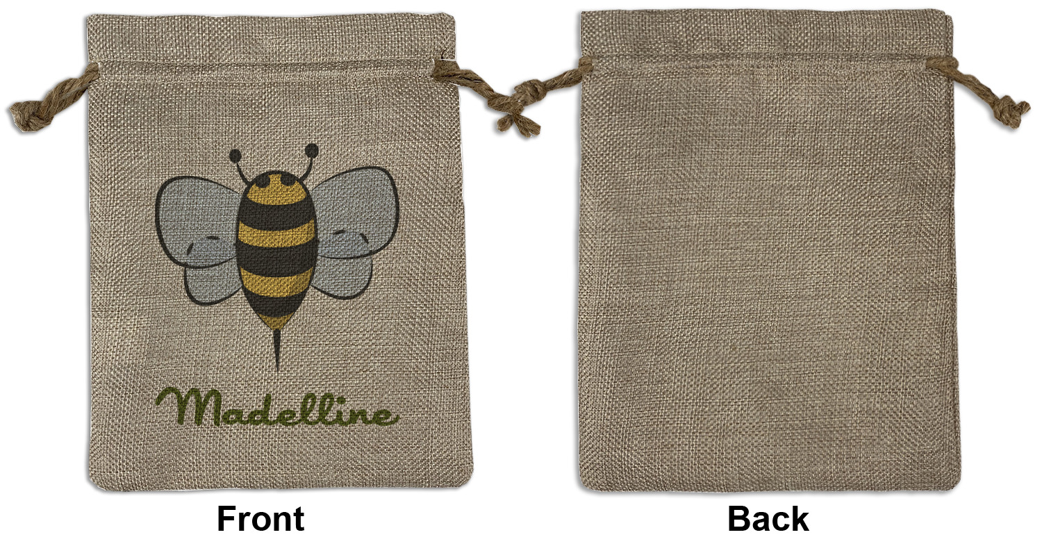 We sell our Burlap Gift Bags in 3 variant sized bags. Made with burlap polyester, each personalized bag can be secured with a twine drawstring pull. Your custom design is available to print on one side or both sides - completely up to you! The sizes of the bags measure approximately 4.5" x 6.5" for the smallest size, 6.5" x 8.0" for the medium size, and 6.5" x 13.5" for the large-sized bag.
