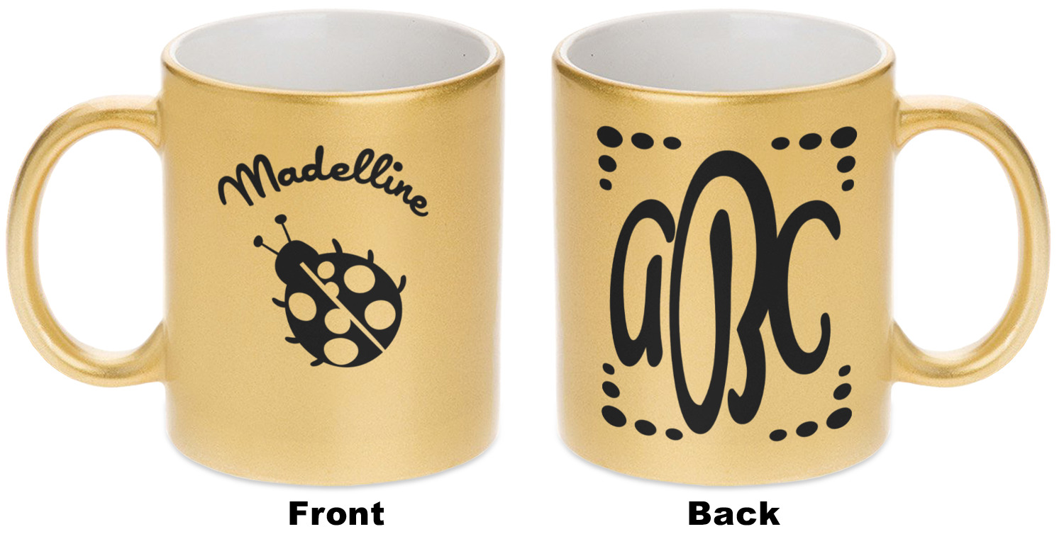 Our custom mugs are ceramic, which is great for keeping your tea or coffee warm! We offer two metallic mugs to personalize - Silver or Gold. Both styles hold around 11oz and have dimensions of approximately 3.75" x 3.5" x 4.75". Both the metallic mugs come in a matte finish and have glitter detailing to add a more pristine feel to the gold and silver base colors.