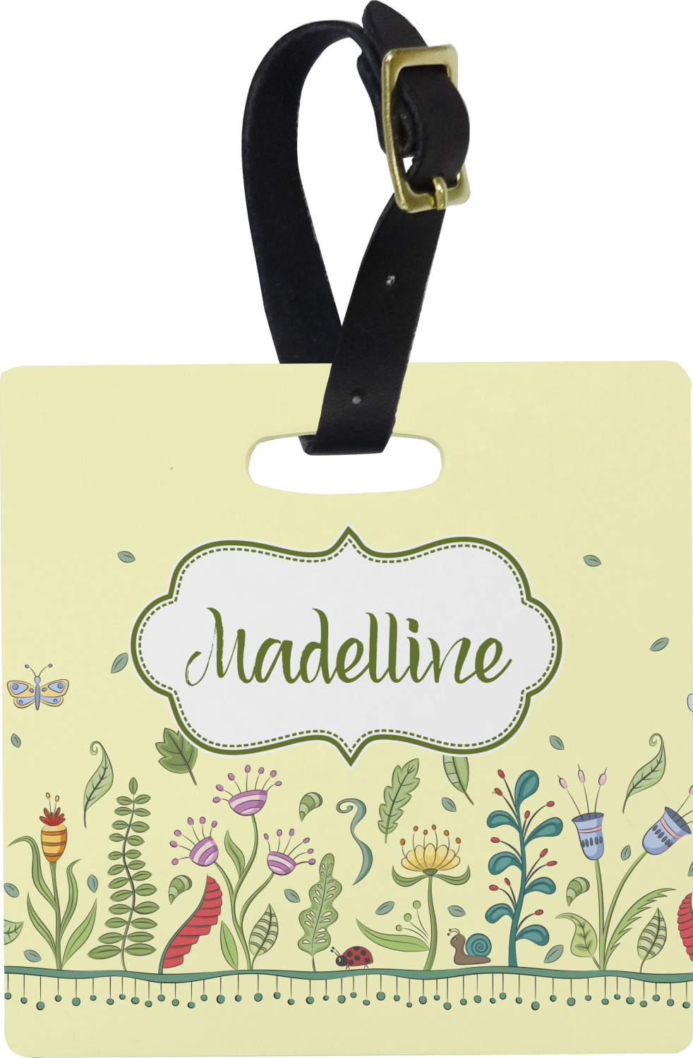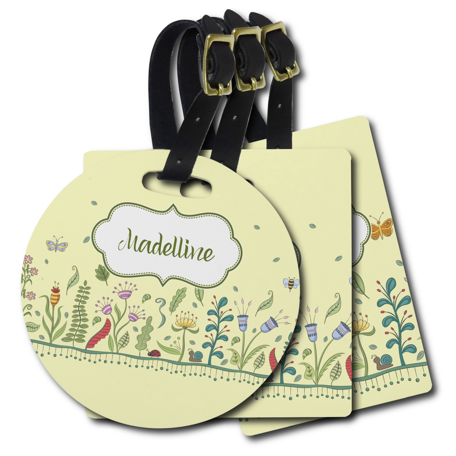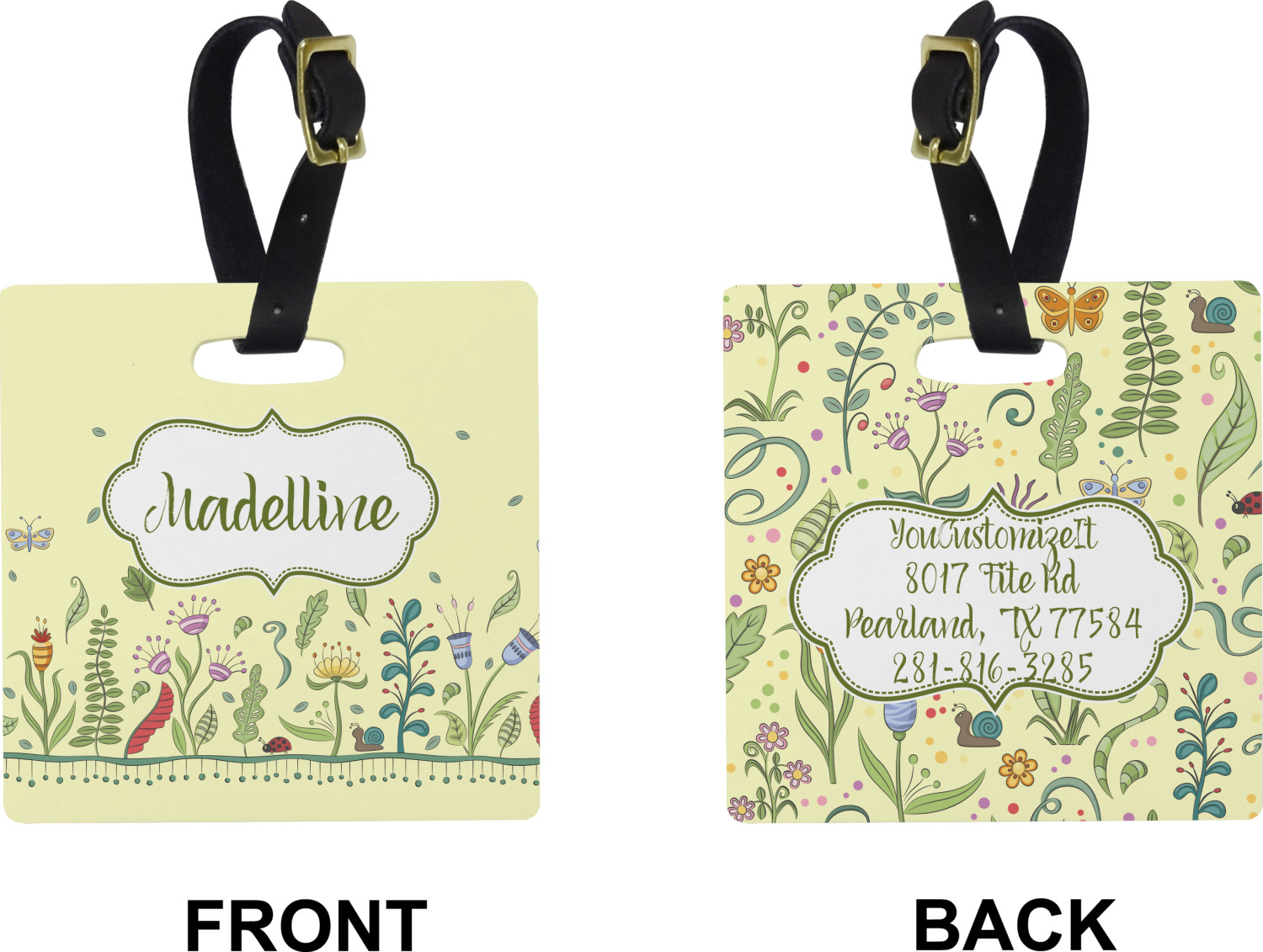 These personalized bag tags are sold in a variety of shapes, so that you may find the product that meets your vision exactly. We sell a round luggage tag, which measures at approximately 4" x 4". Our square luggage tag is about 3.5" x 3.5", while our rectangular version is 2.75" x 4 ".