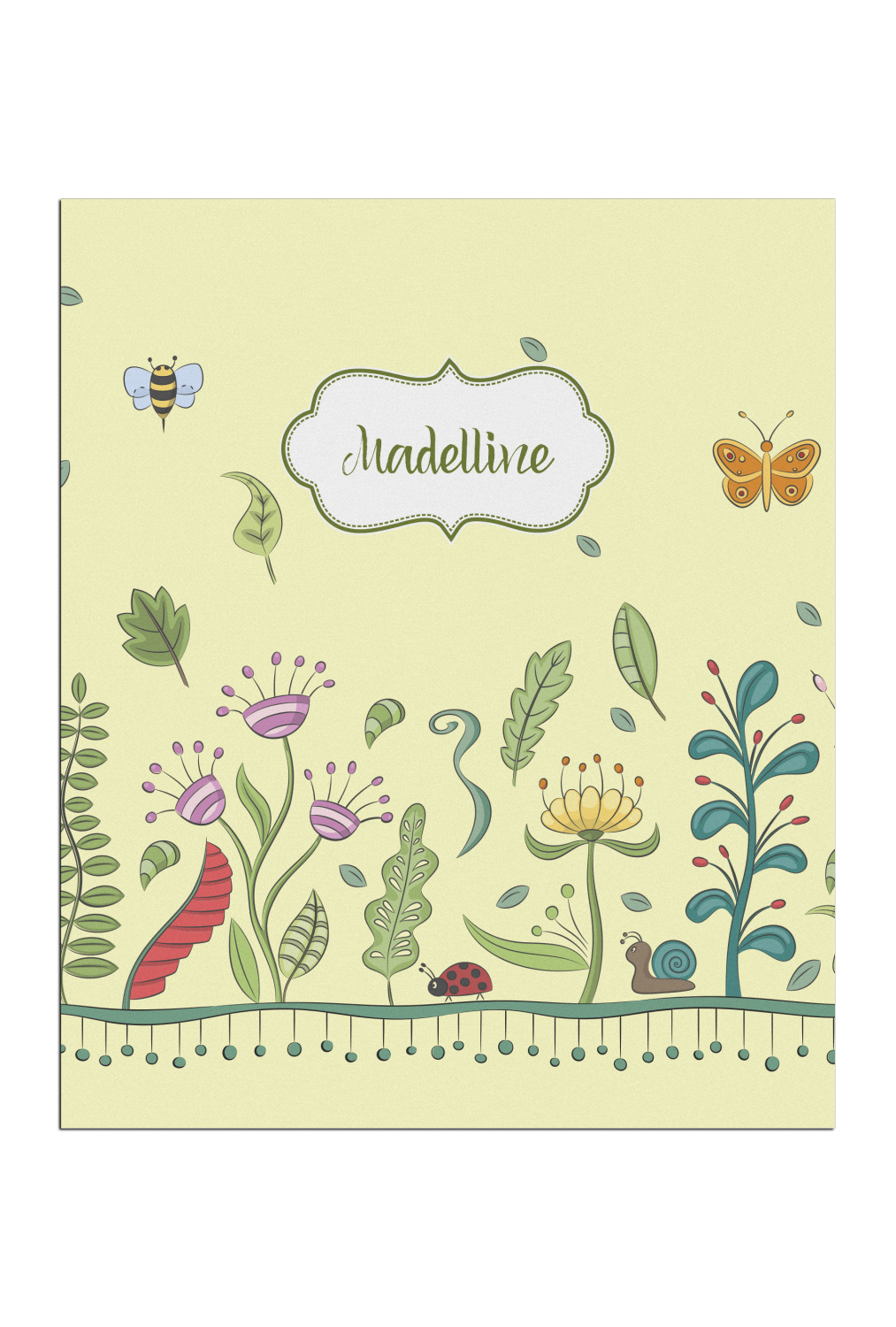 This beautiful, yet simple and elegant nature inspired design consists of growing flowers, leaves and the insects that are found around flowers such as ladybugs, bees, butterflies and snails. We have featured the design with a light yellow background, however, you can change it to any color you want. Changing the background color to a navy blue or black changes the look from sweet to elegant! Your personalization goes in a rectangular label across the top. The coordinating pattern and elements are all related to flowers and insects as well.