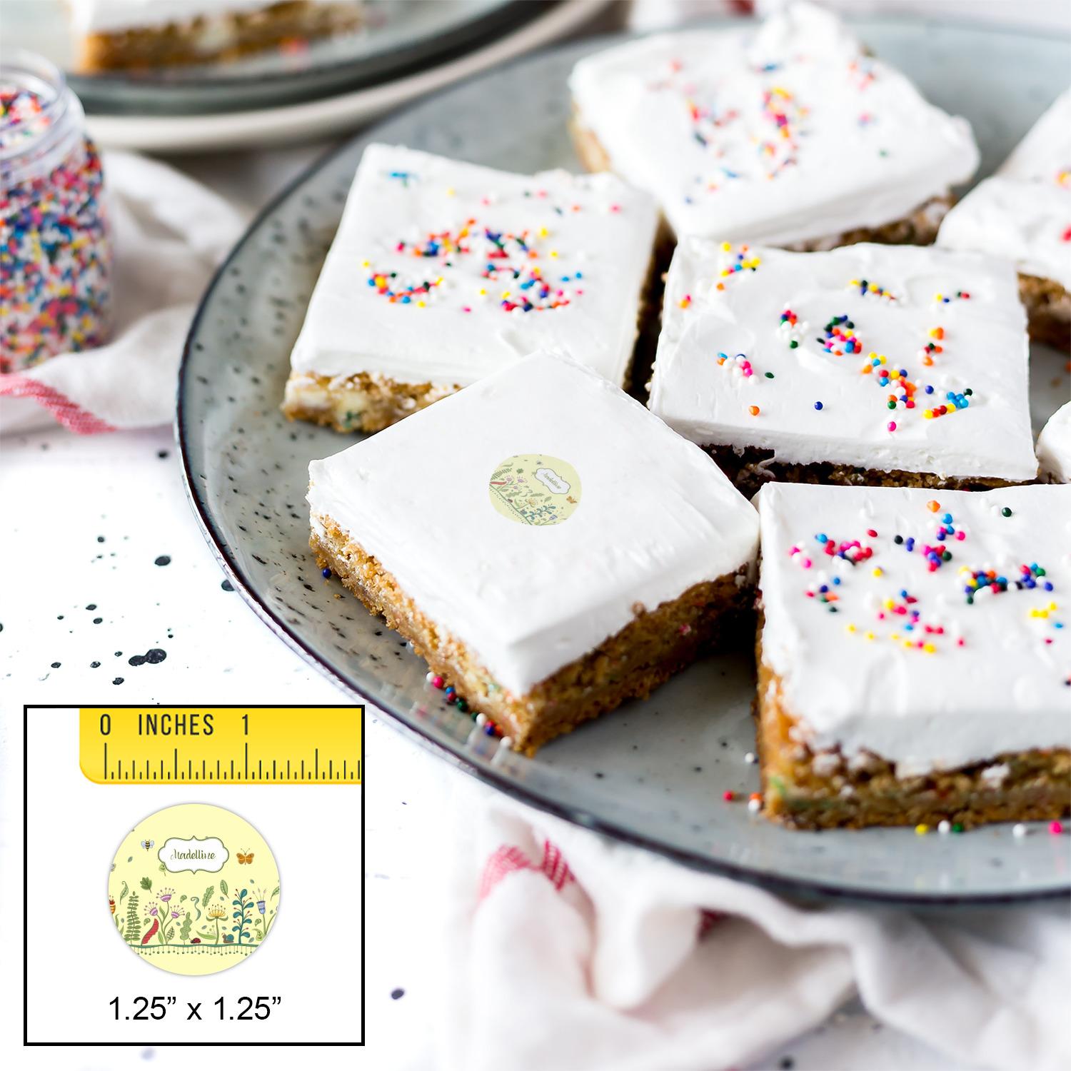 This beautiful, yet simple and elegant nature inspired design consists of growing flowers, leaves and the insects that are found around flowers such as ladybugs, bees, butterflies and snails. We have featured the design with a light yellow background, however, you can change it to any color you want. Changing the background color to a navy blue or black changes the look from sweet to elegant! Your personalization goes in a rectangular label across the top. The coordinating pattern and elements are all related to flowers and insects as well.