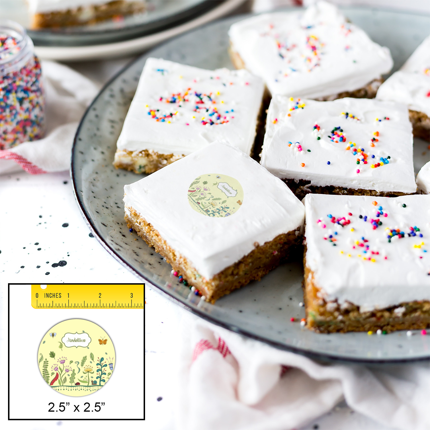 This beautiful, yet simple and elegant nature inspired design consists of growing flowers, leaves and the insects that are found around flowers such as ladybugs, bees, butterflies and snails. We have featured the design with a light yellow background, however, you can change it to any color you want. Changing the background color to a navy blue or black changes the look from sweet to elegant! Your personalization goes in a rectangular label across the top. The coordinating pattern and elements are all related to flowers and insects as well.