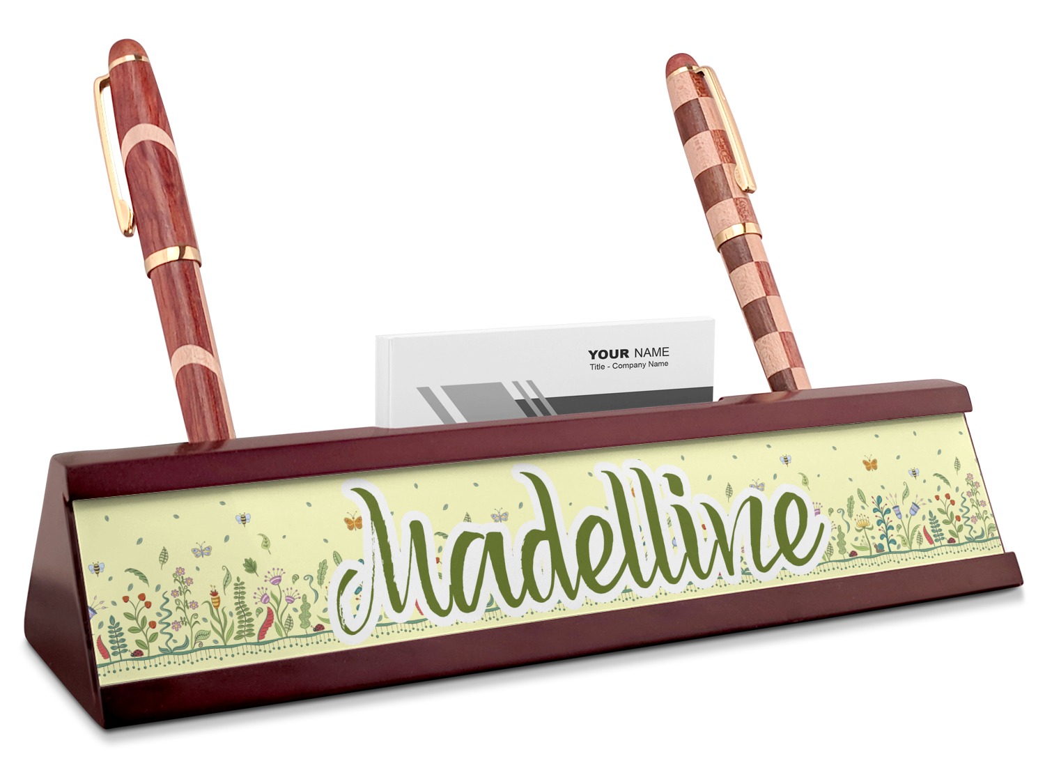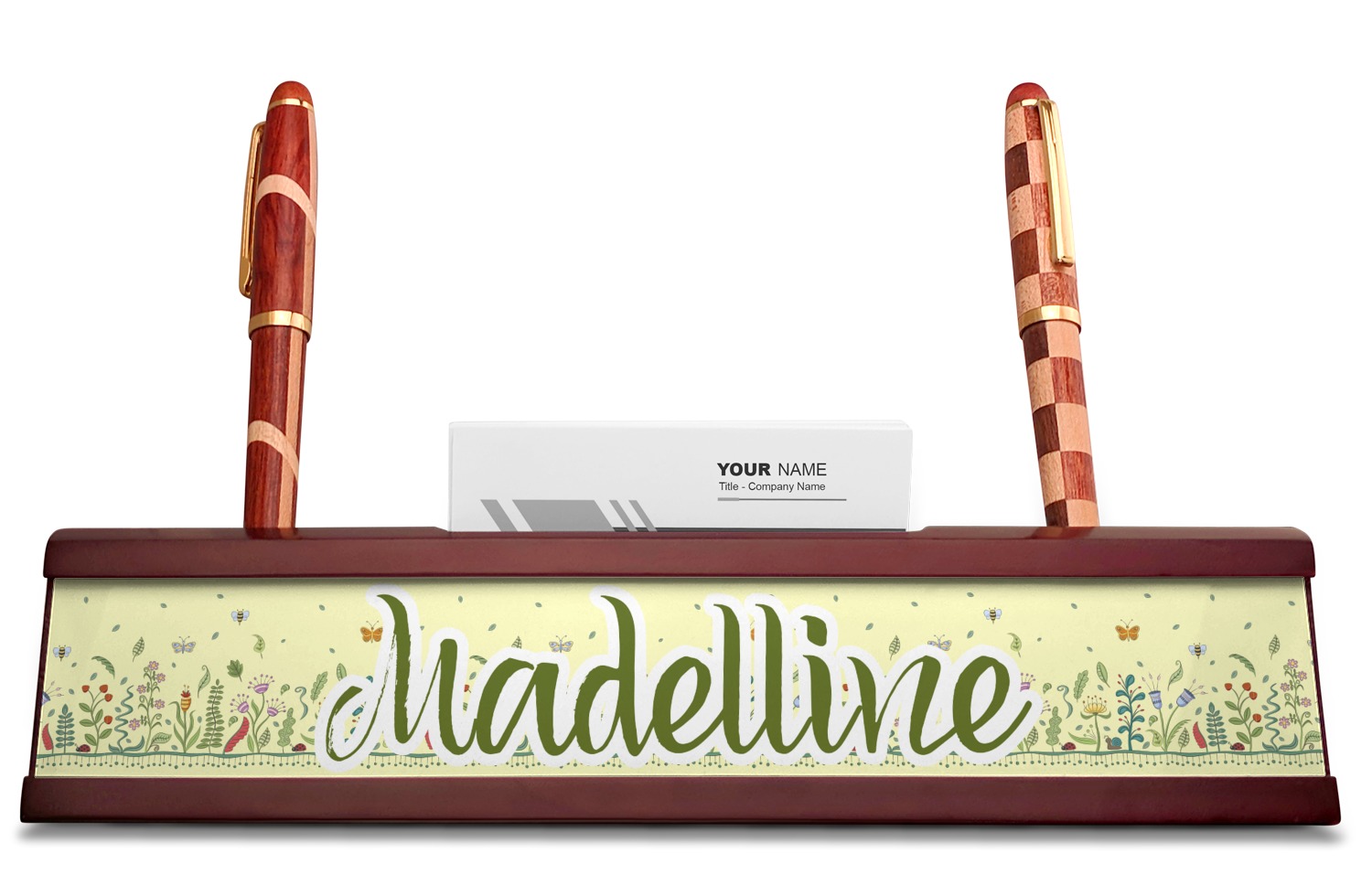 Your desk name plates are crafted from a high-quality, dark-cherry mahogany. At approximately 9.5 by 1.875 by 2.5 inches, this name plaque will fit perfectly, front and center, on your desk. Your customization spans across the entire face of the nameplate. Behind the nameplate lies a skinny slot that can fit approximately 15, traditionally-sized, business cards. You can also store your writing utensils on either side of this custom desk name plate.