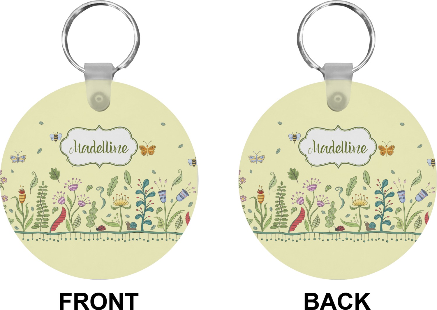 Our personalized keychains attach to the included metal, split key ring with a plastic, removable snap. Since a metal ring is included with your purchase, you have the liberty to keep your keys together on the ring, with or without your unique keychain. We offer this keychain in three different shapes: circle, heart, or diamond. We print your personalized design(s) on both sides of the key chain, and the surface has a glossy, reflective finish that only emphasizes your design. Each keychain is approximately 2.25 by 2.25 inches.