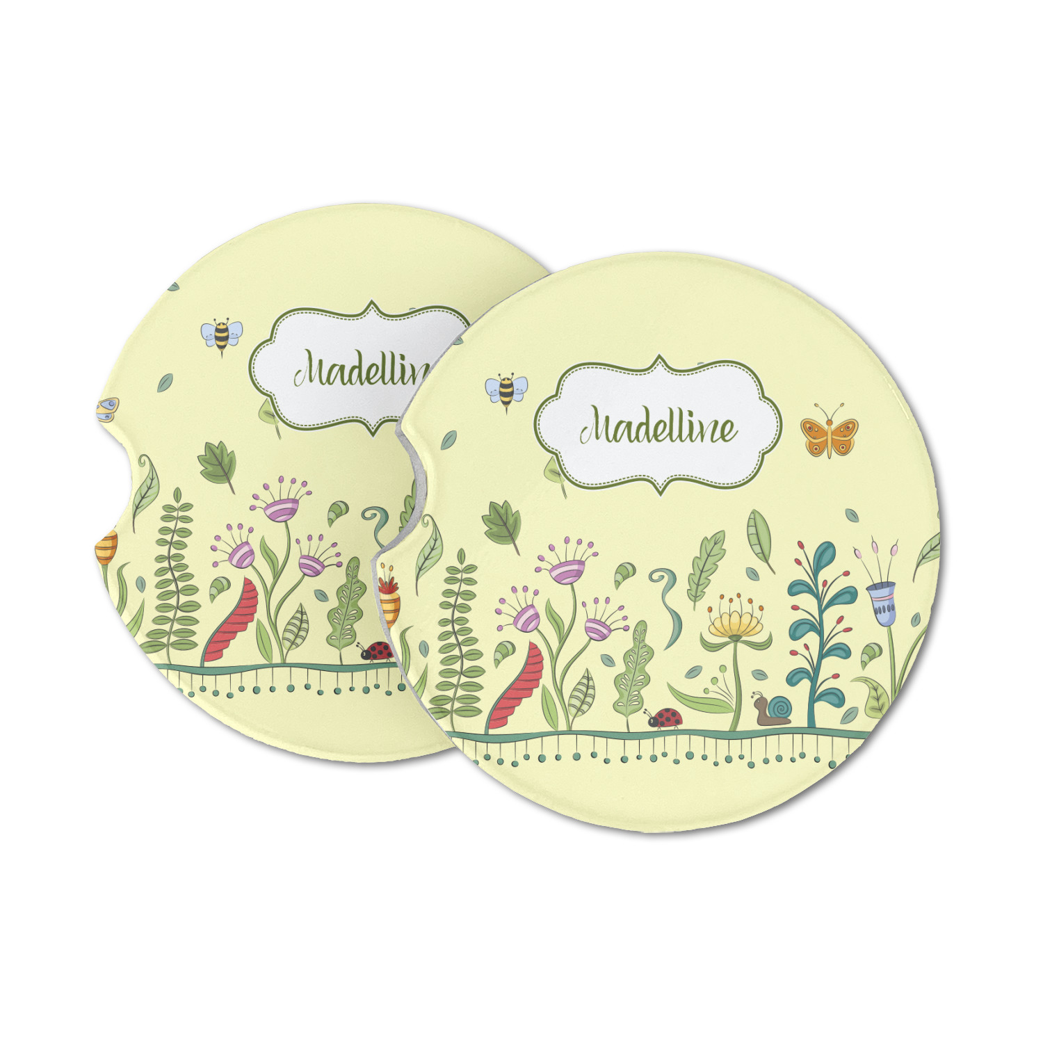 This beautiful, yet simple and elegant nature inspired design consists of growing flowers, leaves and the insects that are found around flowers such as ladybugs, bees, butterflies and snails. We have featured the design with a light yellow background, however, you can change it to any color you want. Changing the background color to a navy blue or black changes the look from sweet to elegant! Your personalization goes in a rectangular label across the top. The coordinating pattern and elements are all related to flowers and insects as well.