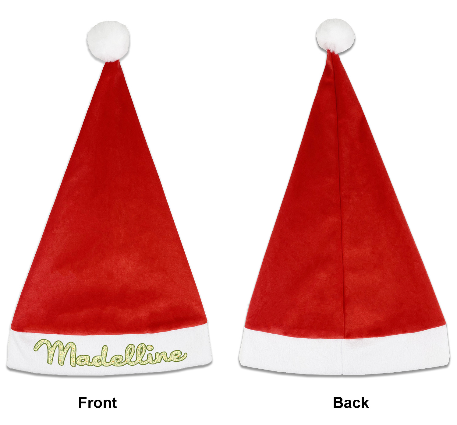 Our Santa hats are a soft, velvety polyester material. These customizable Santa hats are a classic red with white brimming and pom pom ball hanging off the hat tail just like Santa Claus! Each personalized Santa hat is approximately 17.5 L x 11.8 W. We offer two different styles to print your designs on the white brim - front or front & back.