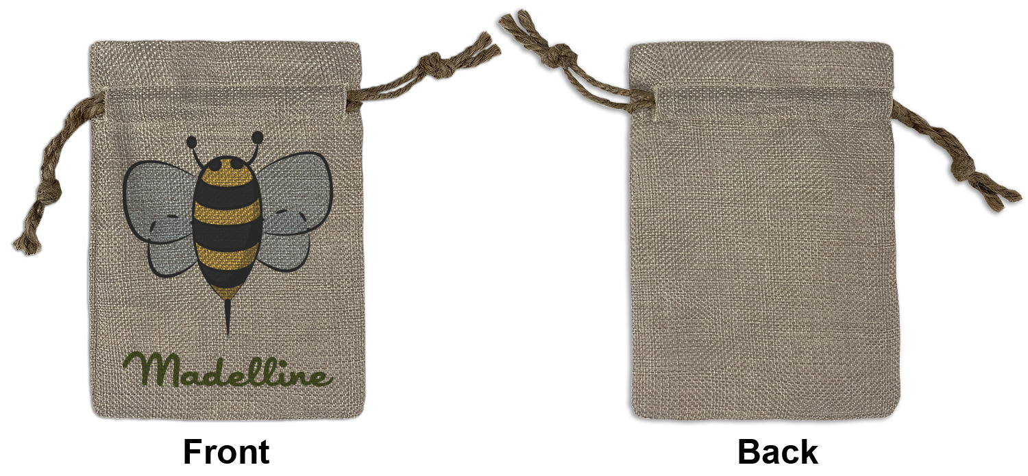 We sell our Burlap Gift Bags in 3 variant sized bags. Made with burlap polyester, each personalized bag can be secured with a twine drawstring pull. Your custom design is available to print on one side or both sides - completely up to you! The sizes of the bags measure approximately 4.5" x 6.5" for the smallest size, 6.5" x 8.0" for the medium size, and 6.5" x 13.5" for the large-sized bag.