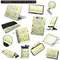 This beautiful, yet simple and elegant nature inspired design consists of growing flowers, leaves and the insects that are found around flowers such as ladybugs, bees, butterflies and snails. We have featured the design with a light yellow background, however, you can change it to any color you want. Changing the background color to a navy blue or black changes the look from sweet to elegant! Your personalization goes in a rectangular label across the top. The coordinating pattern and elements are all related to flowers and insects as well.