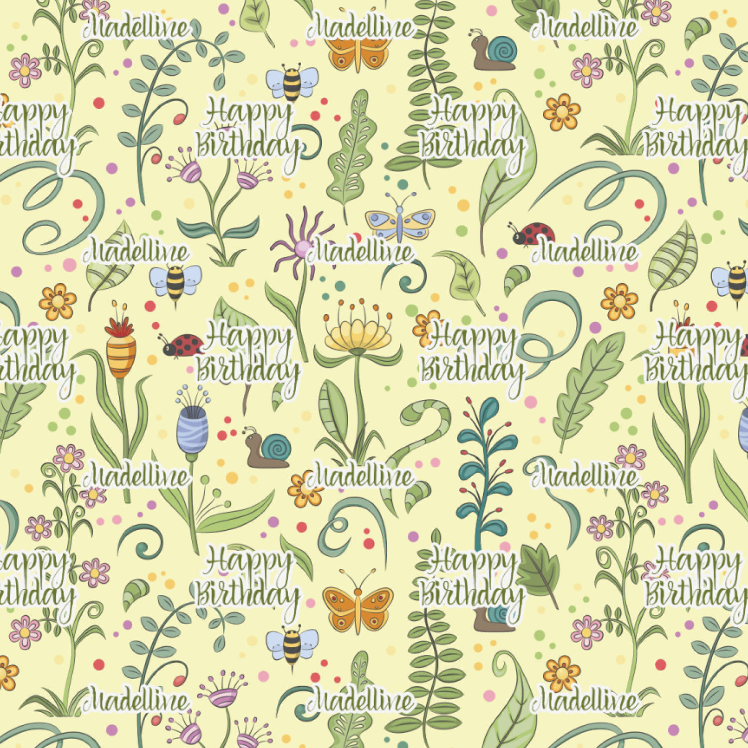This beautiful, yet simple and elegant nature inspired design consists of growing flowers, leaves and the insects that are found around flowers such as ladybugs, bees, butterflies and snails. We have featured the design with a light yellow background, however, you can change it to any color you want. Changing the background color to a navy blue or black changes the look from sweet to elegant! Your personalization goes in a rectangular label across the top. The coordinating pattern and elements are all related to flowers and insects as well.