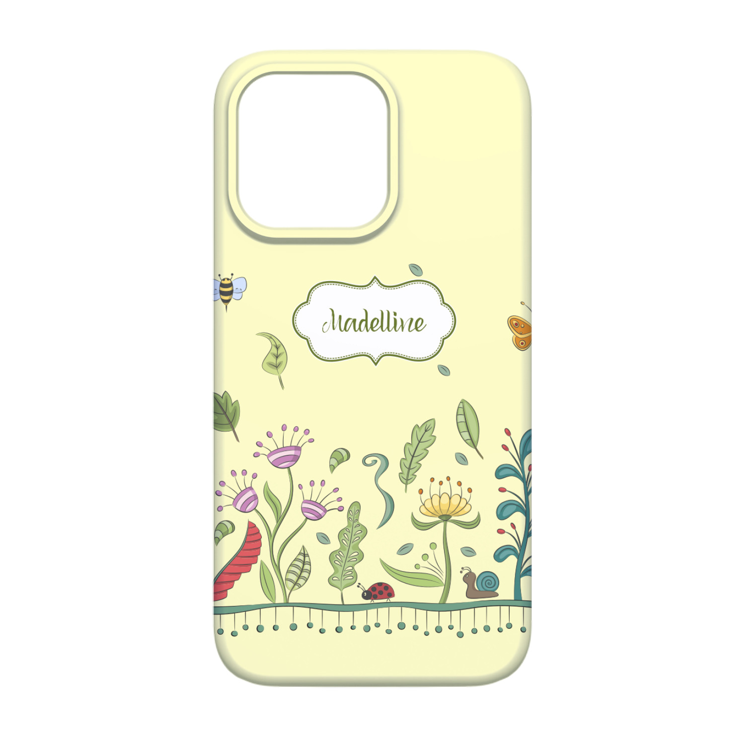 This beautiful, yet simple and elegant nature inspired design consists of growing flowers, leaves and the insects that are found around flowers such as ladybugs, bees, butterflies and snails. We have featured the design with a light yellow background, however, you can change it to any color you want. Changing the background color to a navy blue or black changes the look from sweet to elegant! Your personalization goes in a rectangular label across the top. The coordinating pattern and elements are all related to flowers and insects as well.
