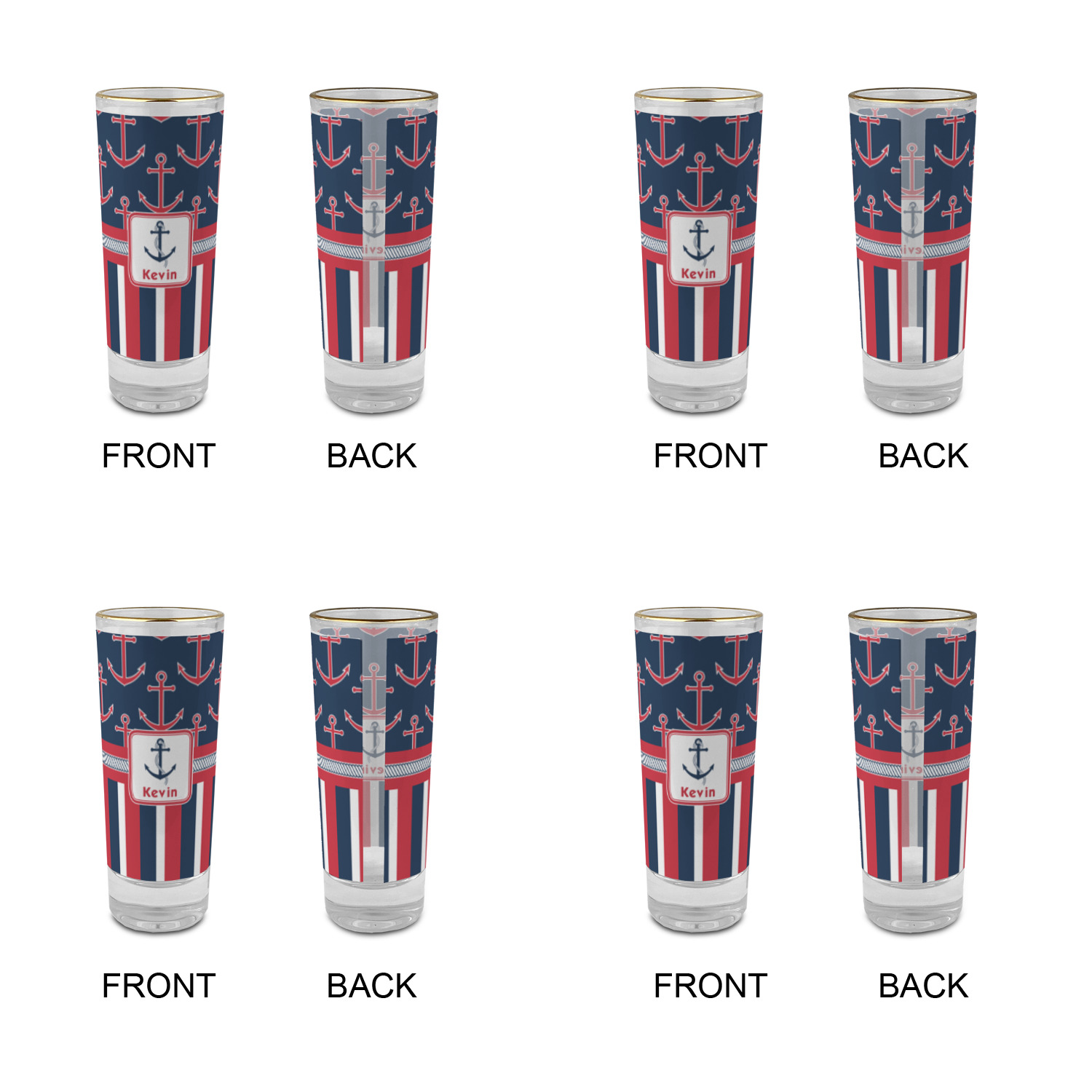 These glass shooter glasses are printed in full color with the design of your choice. These are a tall shooter 2 oz size and stand 4" tall. The print is a full wrap design to boldly display your personalization.