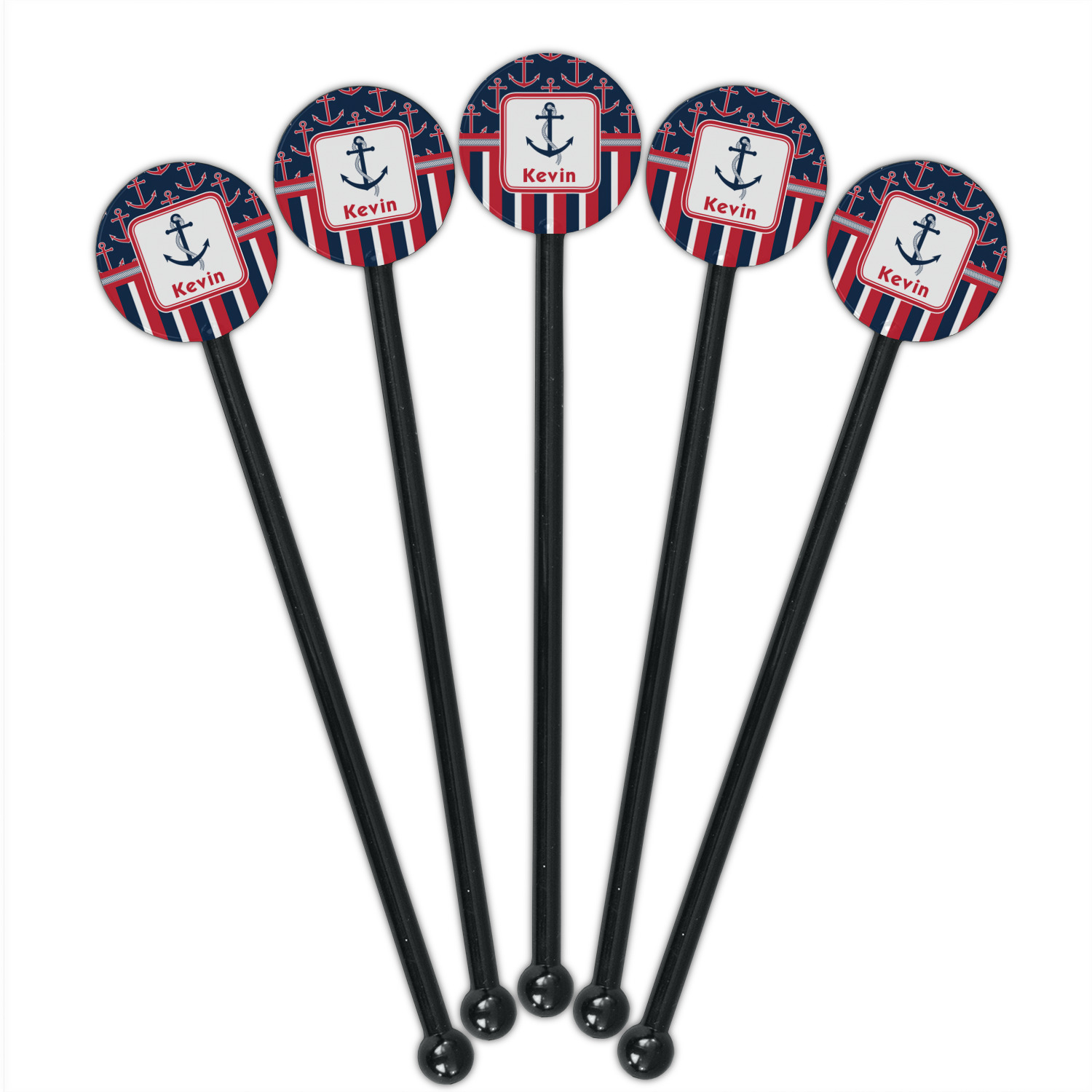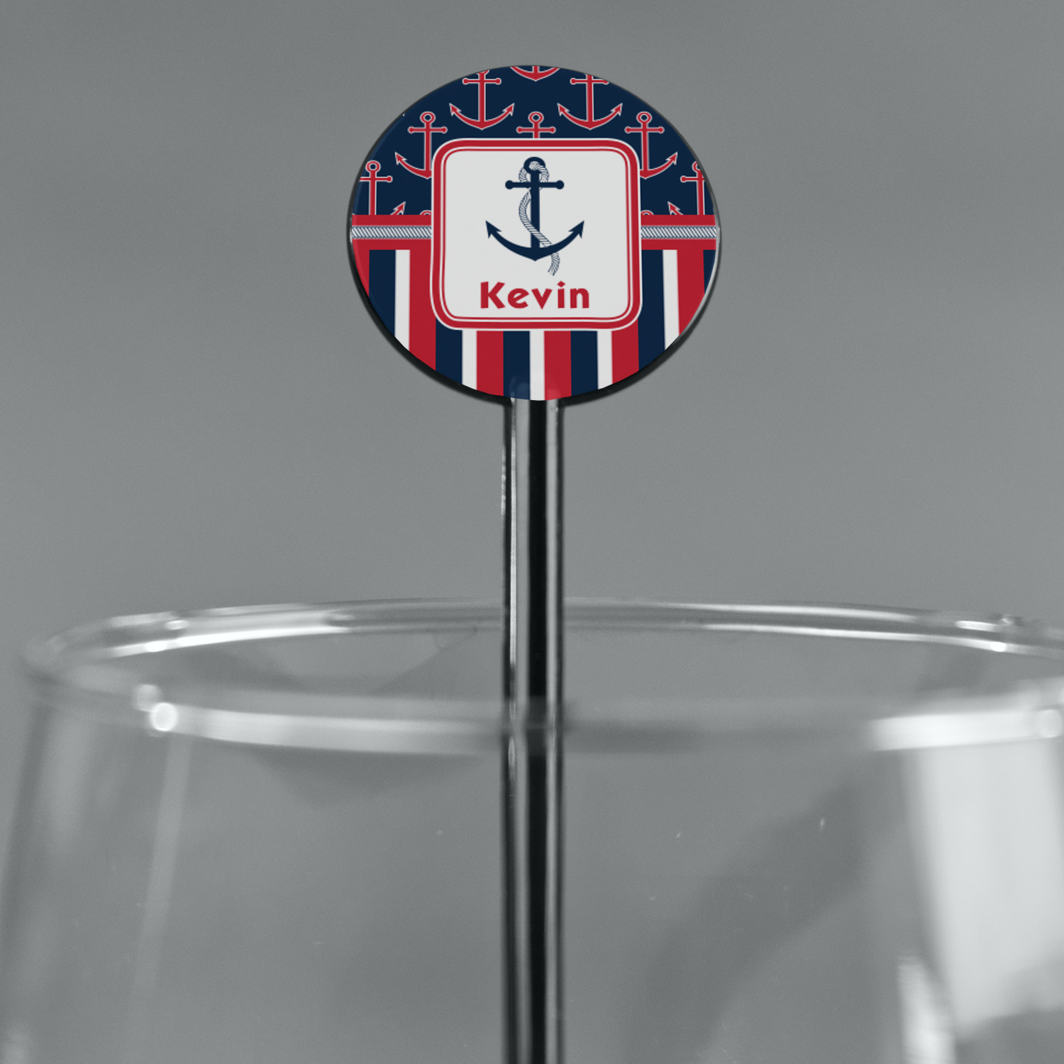 This nautical design features anchor pattern on top and stripes on the bottom. We chose to use the classic navy, red and white colors for our design. We chose the ribbon with rope, along with a squarish frame that contains a graphic and text. We use the anchor with rope for our graphic and a name for our text / personalization.