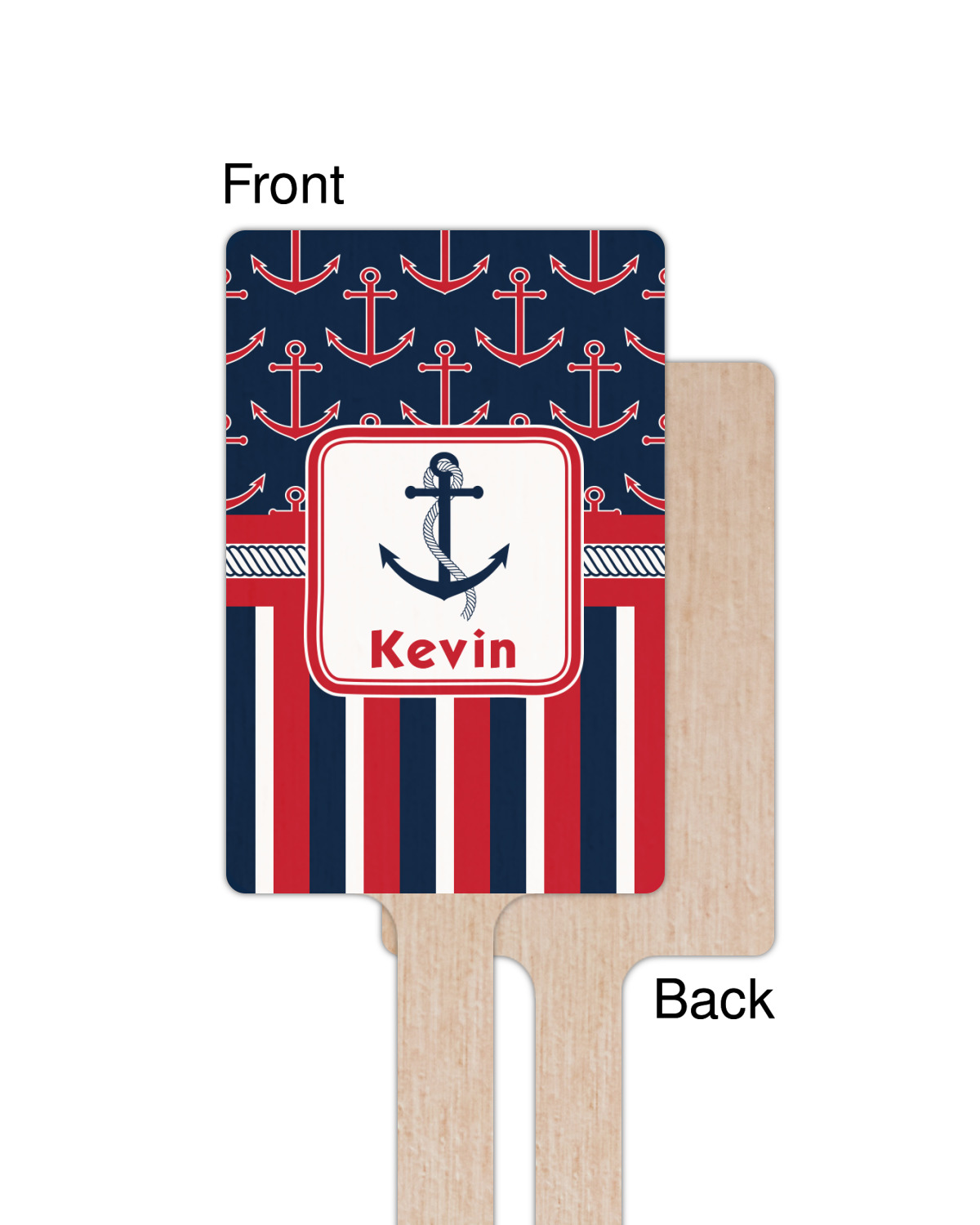 This nautical design features anchor pattern on top and stripes on the bottom. We chose to use the classic navy, red and white colors for our design. We chose the ribbon with rope, along with a squarish frame that contains a graphic and text. We use the anchor with rope for our graphic and a name for our text / personalization.