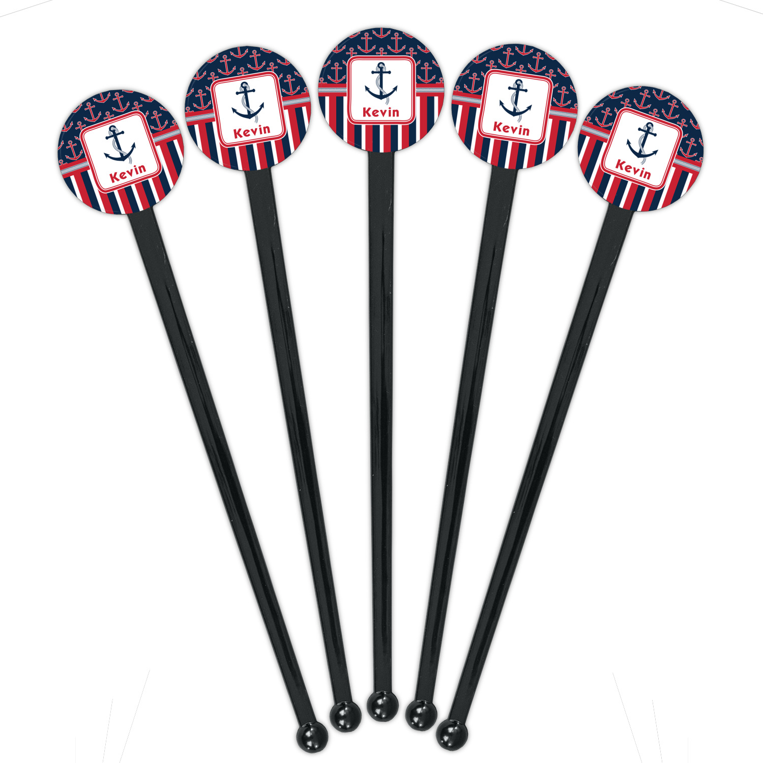 This nautical design features anchor pattern on top and stripes on the bottom. We chose to use the classic navy, red and white colors for our design. We chose the ribbon with rope, along with a squarish frame that contains a graphic and text. We use the anchor with rope for our graphic and a name for our text / personalization.
