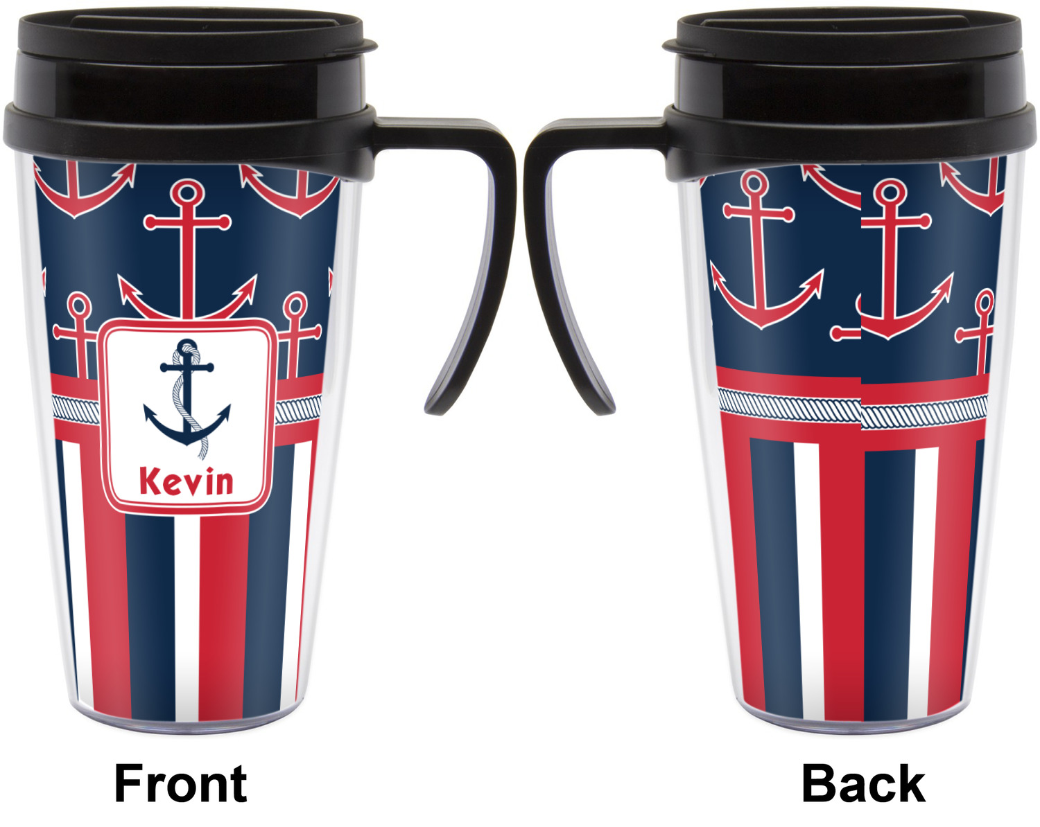 These thermal mugs are free of BPA, and insulated, to keep your drinks hot or cold. The black, snap on lid and the slider for sipping allows you to conveniently sip your drink without constantly worrying about a disastrous spill. We offer this mug with and without a handle, to better suit your needs. Each custom thermal mug holds up to 16 ounces of liquid and displays your customization on all sides on premium gloss media inserts.