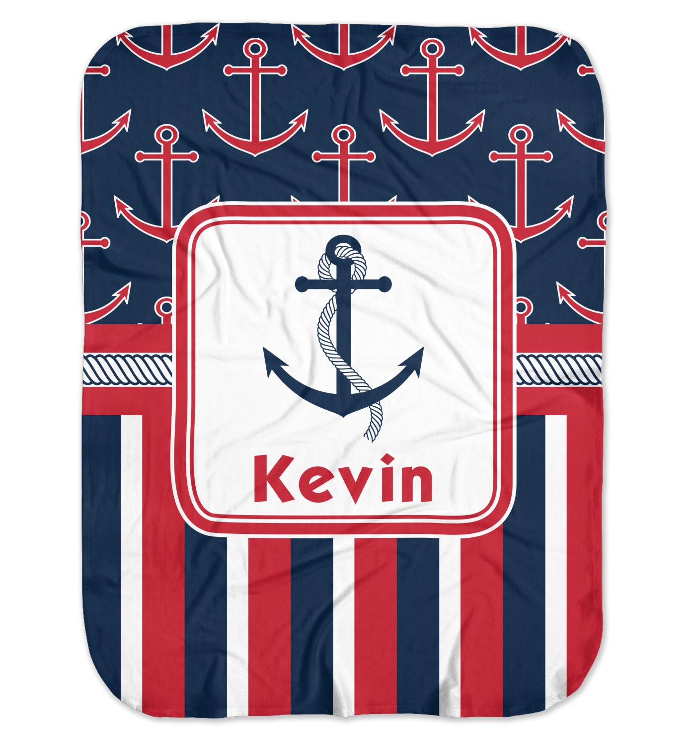 This nautical design features anchor pattern on top and stripes on the bottom. We chose to use the classic navy, red and white colors for our design. We chose the ribbon with rope, along with a squarish frame that contains a graphic and text. We use the anchor with rope for our graphic and a name for our text / personalization.