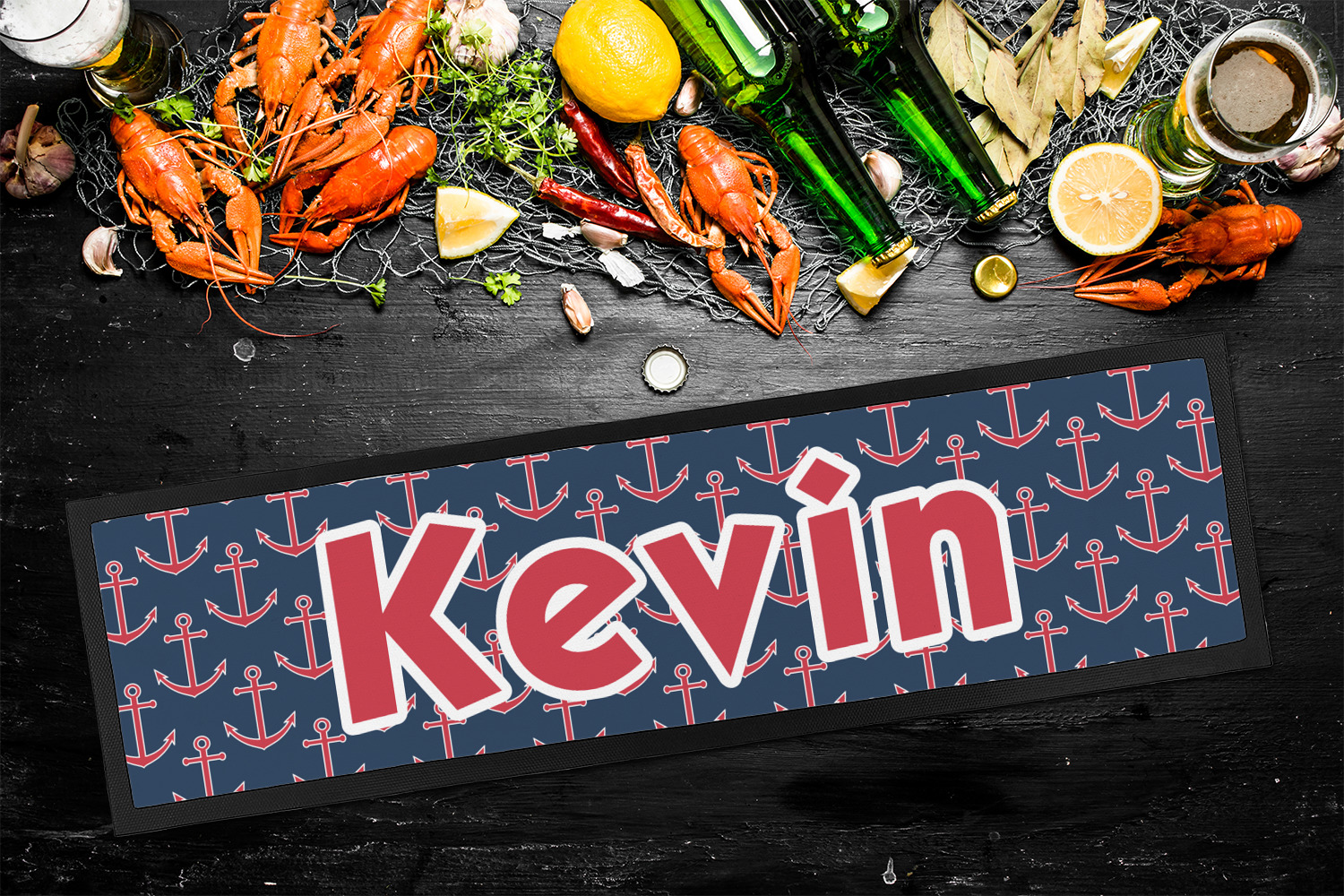 This nautical design features anchor pattern on top and stripes on the bottom. We chose to use the classic navy, red and white colors for our design. We chose the ribbon with rope, along with a squarish frame that contains a graphic and text. We use the anchor with rope for our graphic and a name for our text / personalization.