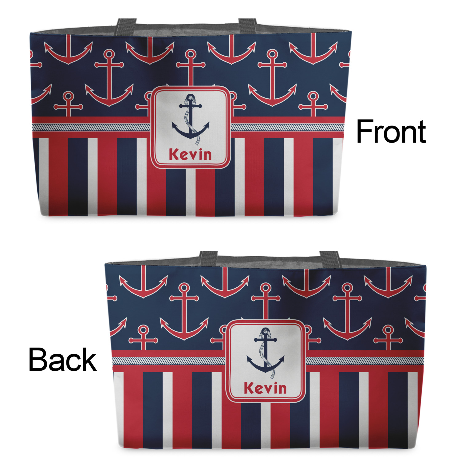 This nautical design features anchor pattern on top and stripes on the bottom. We chose to use the classic navy, red and white colors for our design. We chose the ribbon with rope, along with a squarish frame that contains a graphic and text. We use the anchor with rope for our graphic and a name for our text / personalization.