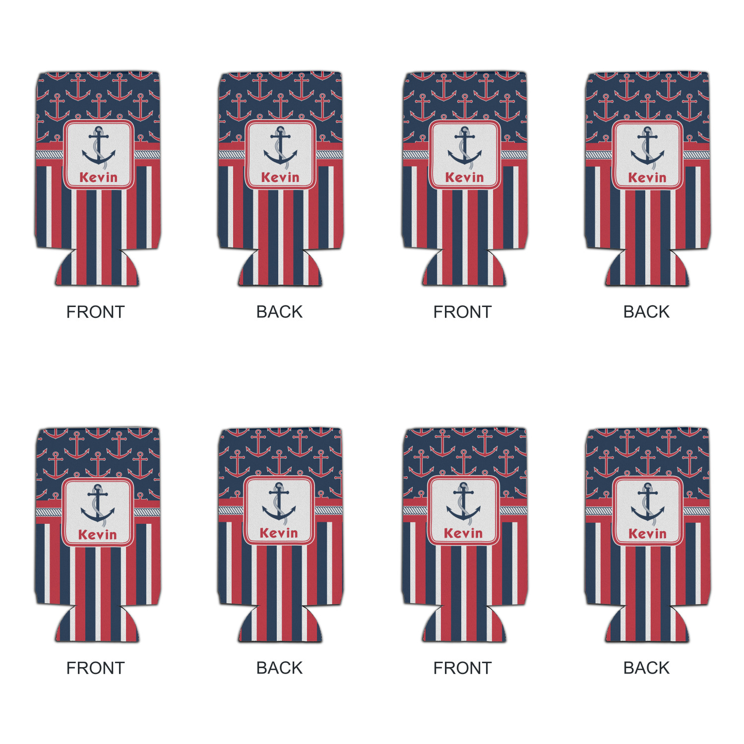 This nautical design features anchor pattern on top and stripes on the bottom. We chose to use the classic navy, red and white colors for our design. We chose the ribbon with rope, along with a squarish frame that contains a graphic and text. We use the anchor with rope for our graphic and a name for our text / personalization.