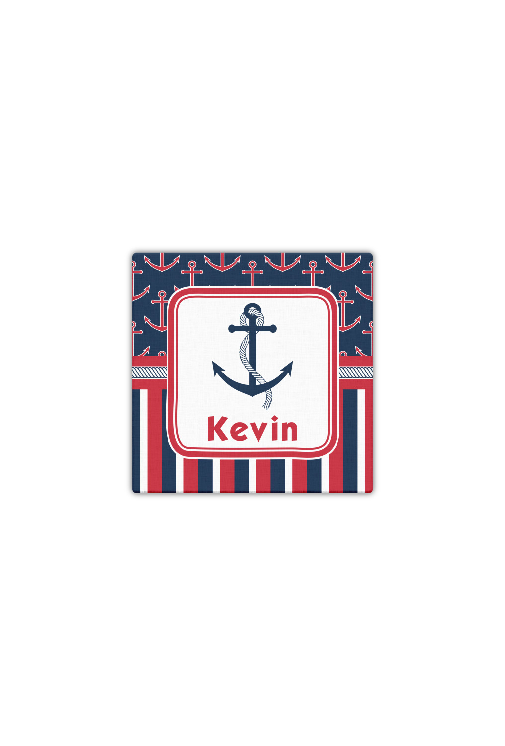 This nautical design features anchor pattern on top and stripes on the bottom. We chose to use the classic navy, red and white colors for our design. We chose the ribbon with rope, along with a squarish frame that contains a graphic and text. We use the anchor with rope for our graphic and a name for our text / personalization.