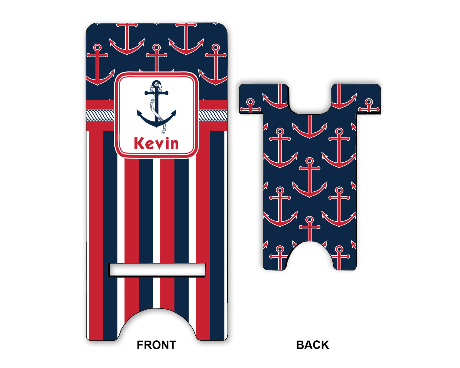 This nautical design features anchor pattern on top and stripes on the bottom. We chose to use the classic navy, red and white colors for our design. We chose the ribbon with rope, along with a squarish frame that contains a graphic and text. We use the anchor with rope for our graphic and a name for our text / personalization.
