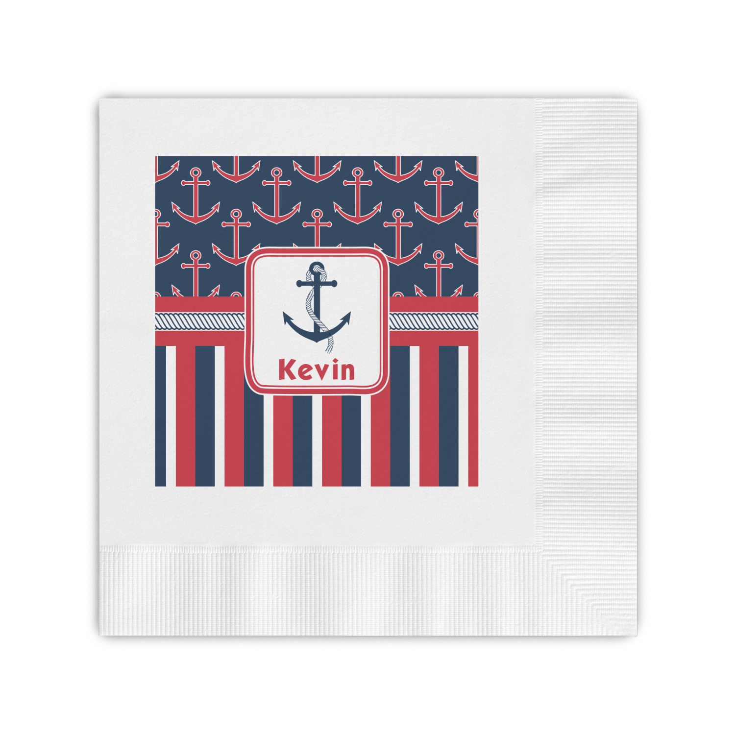 This nautical design features anchor pattern on top and stripes on the bottom. We chose to use the classic navy, red and white colors for our design. We chose the ribbon with rope, along with a squarish frame that contains a graphic and text. We use the anchor with rope for our graphic and a name for our text / personalization.