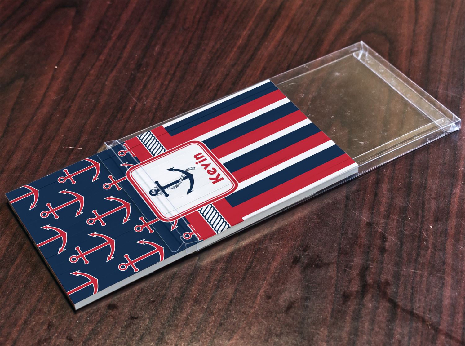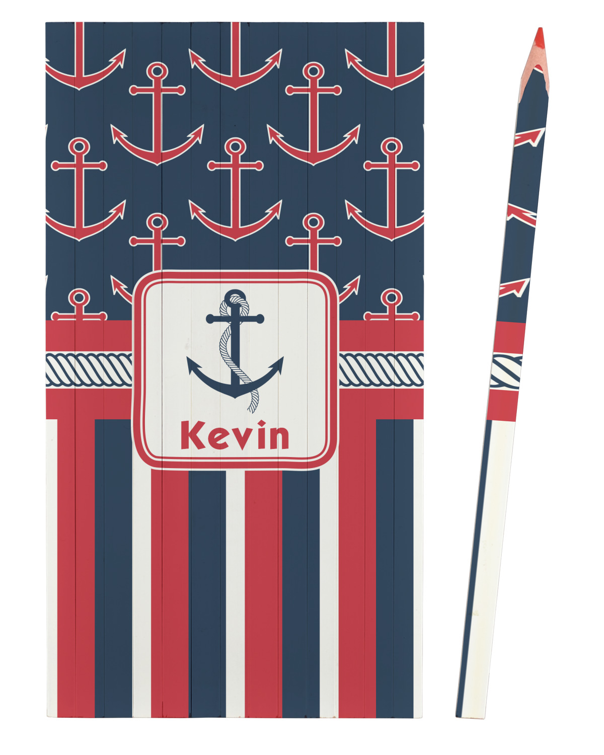 This nautical design features anchor pattern on top and stripes on the bottom. We chose to use the classic navy, red and white colors for our design. We chose the ribbon with rope, along with a squarish frame that contains a graphic and text. We use the anchor with rope for our graphic and a name for our text / personalization.
