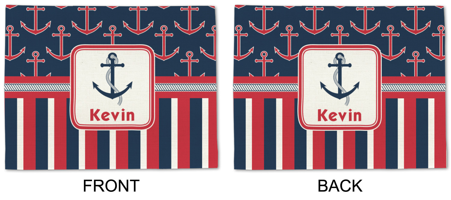 This nautical design features anchor pattern on top and stripes on the bottom. We chose to use the classic navy, red and white colors for our design. We chose the ribbon with rope, along with a squarish frame that contains a graphic and text. We use the anchor with rope for our graphic and a name for our text / personalization.