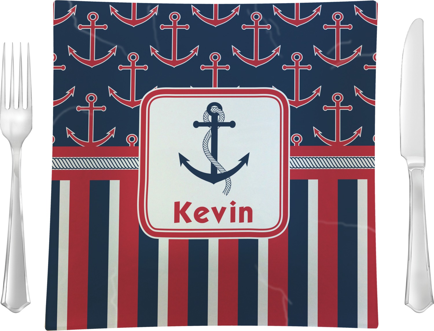 This nautical design features anchor pattern on top and stripes on the bottom. We chose to use the classic navy, red and white colors for our design. We chose the ribbon with rope, along with a squarish frame that contains a graphic and text. We use the anchor with rope for our graphic and a name for our text / personalization.