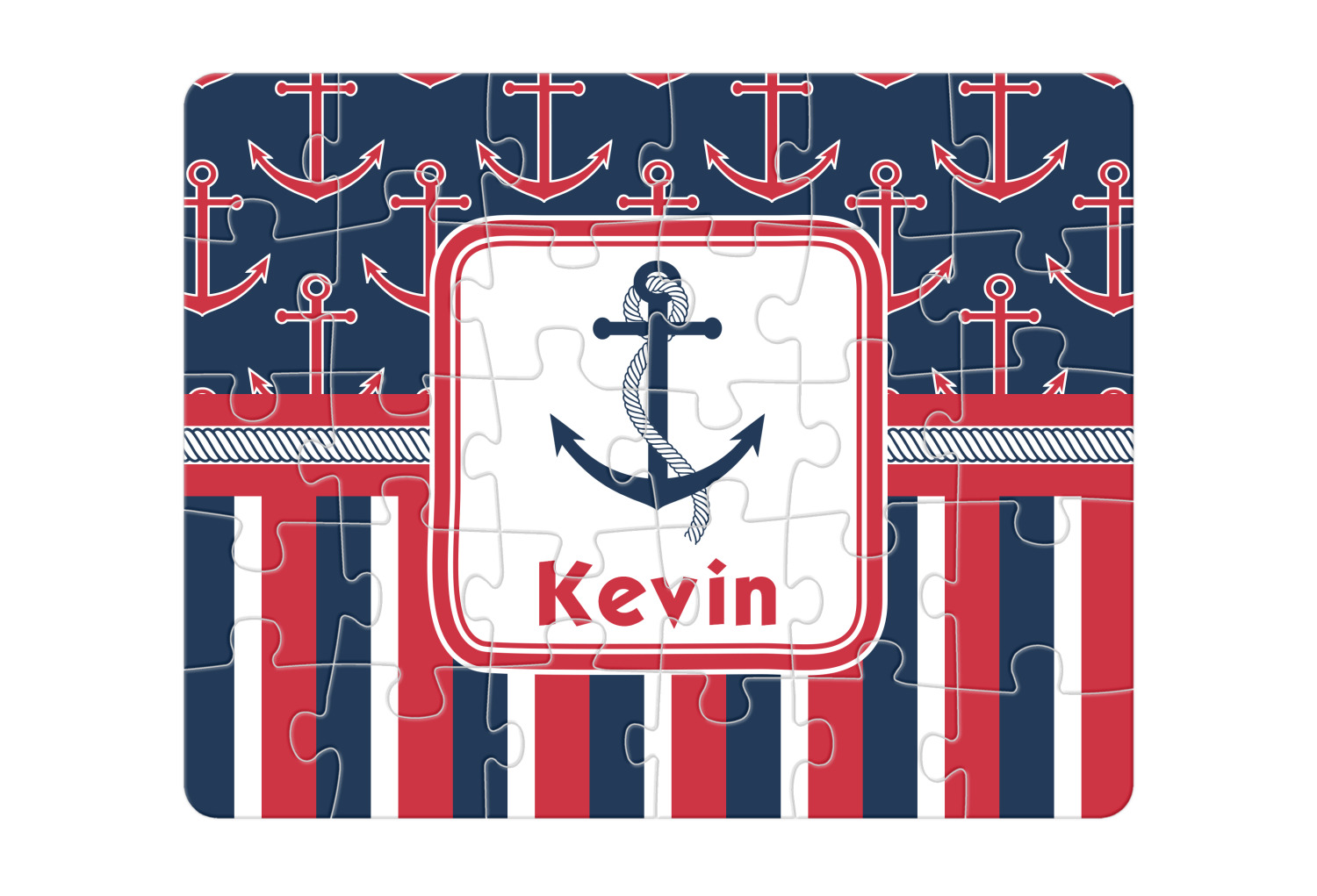 This nautical design features anchor pattern on top and stripes on the bottom. We chose to use the classic navy, red and white colors for our design. We chose the ribbon with rope, along with a squarish frame that contains a graphic and text. We use the anchor with rope for our graphic and a name for our text / personalization.