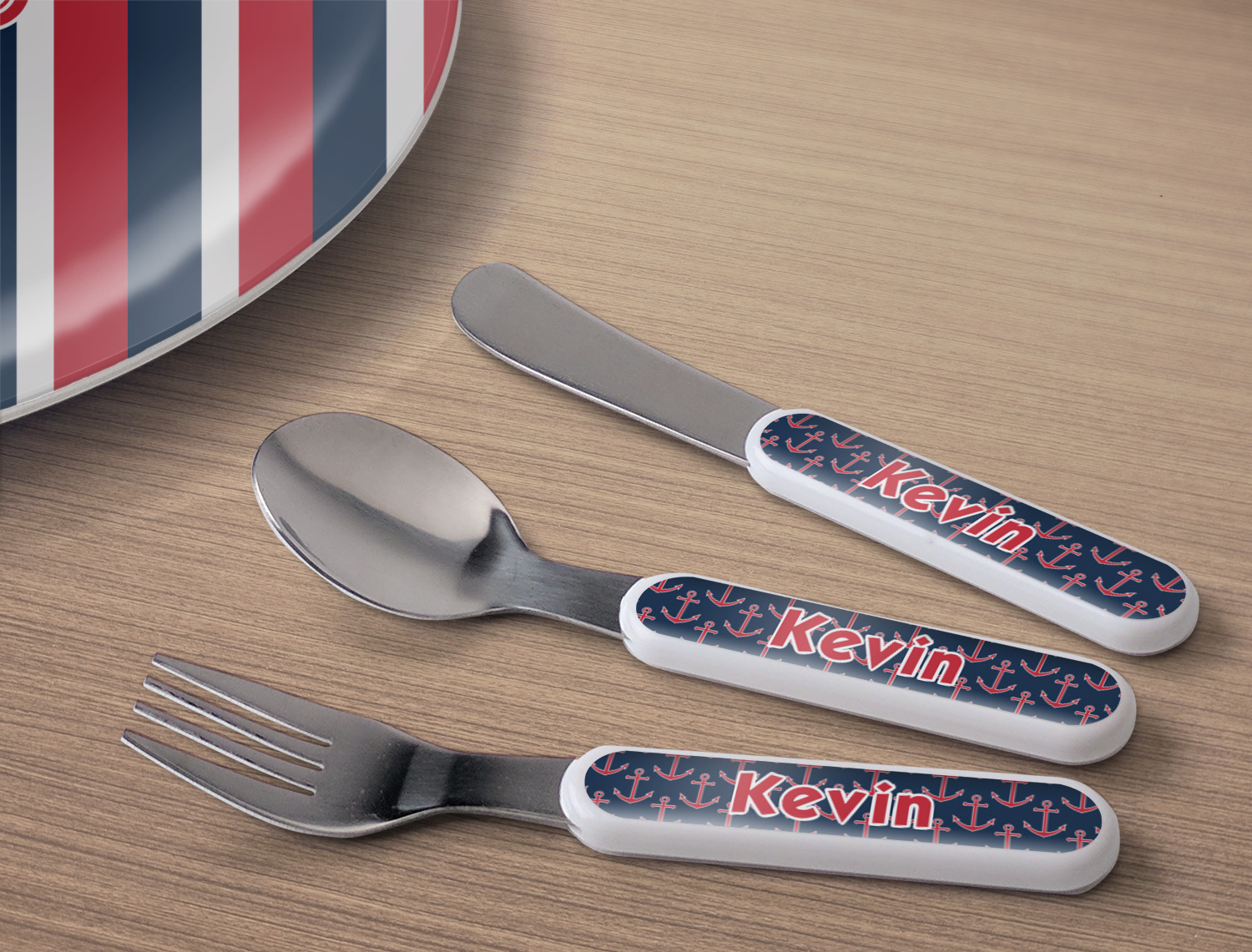 This set of kids' silverware includes a 5.5 inch spoon, fork, and knife, catered to your little one's needs. The prongs of this fork are flat and dull, while our spoon is small enough for tiny mouths, and the dullness of the knife itself resembles a butter knife, at most. These kids' utensils are made of stainless steel, while the handles are crafted from a durable plastic that will withstand the energy and use of your young one. We print your customization across the handles, making the cutlery set unique to your child only.