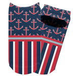 This nautical design features anchor pattern on top and stripes on the bottom. We chose to use the classic navy, red and white colors for our design. We chose the ribbon with rope, along with a squarish frame that contains a graphic and text. We use the anchor with rope for our graphic and a name for our text / personalization.